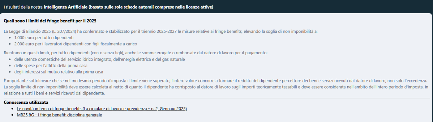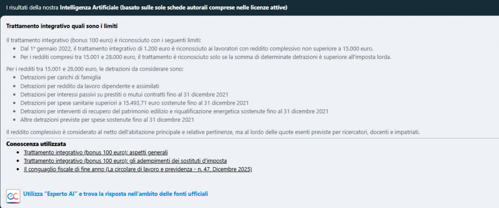 Tra gli aspetti peculiari della disciplina, troviamo la verifica della spettanza del trattamento integrativo e dei fringe benefit. Su questi punti possiamo interrogare l’AI per ottenere delle informazioni aggiornate e sintetiche, rimandando poi agli approfondimenti suggeriti dalla stessa per una verifica di eventuali casi specifici.