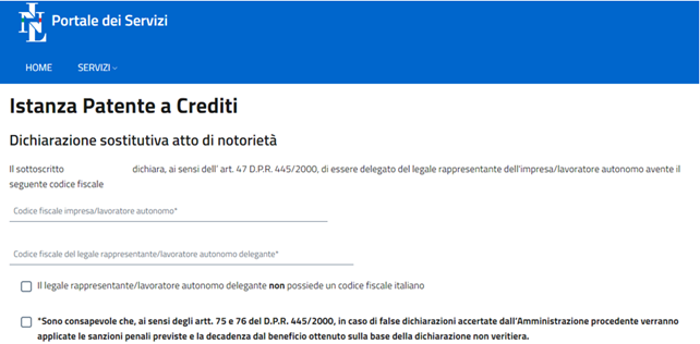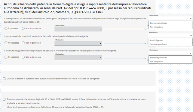 In caso di richiesta della patente da parte dei soggetti delegati, questi ultimi dovranno munirsi delle dichiarazioni rilasciate dal legale rappresentante dell’impresa o dal lavoratore autonomo relative al possesso dei requisiti sopra illustrati, le quali potranno essere richieste in caso di eventuali accertamenti.