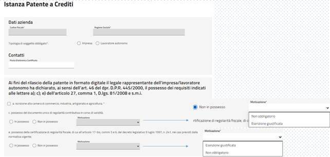 Altra precisazione, salvo casi particolari, ad esempio, legati all’esistenza di contenziosi sull’obbligatorietà di uno o più requisiti, riguarda il fatto che alcuni requisiti sono sempre richiesti sia alle imprese sia ai lavoratori autonomi (ad esempio, iscrizione alla CCIAA); altri sono, invece, normalmente richiesti solo alle imprese e non anche ai lavoratori autonomi (ad esempio, possesso del DVR e designazione del Rspp) e altri sono richiesti solo in determinate ipotesi (ad esempio, gli obblighi formativi in capo ai lavoratori autonomi sono obbligatori solo in caso d’utilizzo di attrezzature per le quali sia richiesta una specifica formazione). Il portale, pertanto, in relazione a ciascuna categoria di richiedenti e in considerazione della particolarità delle casistiche, consentirà d’indicare anche la “non obbligatorietà” o “l’esenzione giustificata” da un determinato requisito.