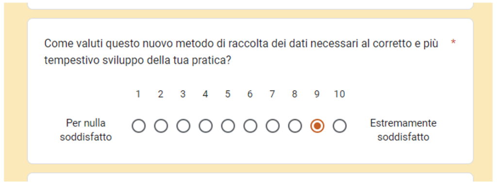 - ipotizzando di inserire una domanda nel form, a conclusione della raccolta dati (come da cattura schermo a seguire) che richiede un feedback di gradimento, basterebbe calcolare sempre trimestralmente una media delle risposte ottenute.