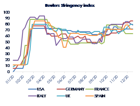 La revisione al rialzo delle previsioni riflette gli effetti positivi derivanti dall’inizio delle vaccinazioni anti-Covid, dalle attese per la riapertura del comparto dei servizi a più elevata intensità di contatto conseguenti al previsto risolversi della crisi sanitaria in atto e dallo stimolo alla crescita del nuovo pacchetto fiscale statunitense e giapponese. Questi sviluppi indicano un punto di partenza più stabile per le prospettive di crescita del 2021-22. Infatti, i dati economici rilasciati dopo la pubblicazione delle prevsioni del World Economic Outlook di ottobre 2020 suggeriscono uno slancio più forte del previsto in media in tutte le regioni nella seconda metà del 2020. Tuttavia, il FMI riconosce che nel brevissimo termine gli effetti positivi di queste tre circostanze saranno parzialmente frenati dalle nuove misure di contenimento, che restano ancora elevate in molti paesi (Fig.1).