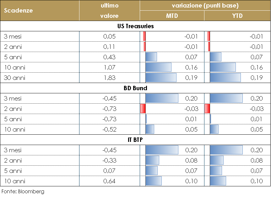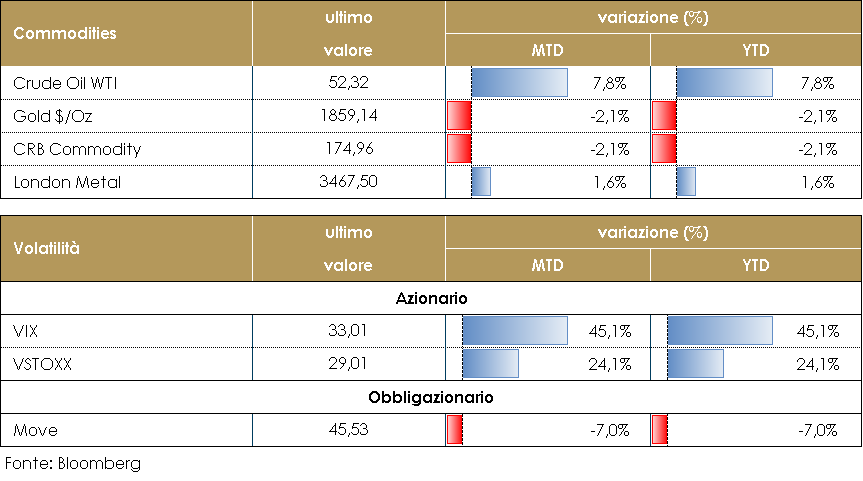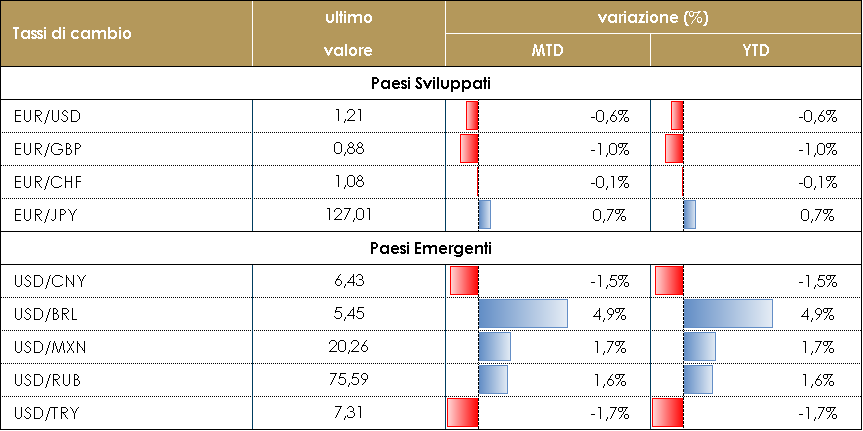 Il Dollaro americano è stato il principale beneficiario del clima di risk off: si è apprezzato nei confronti di tutte le valute del G10 e di gran parte di quelle dei paesi emergenti. Tuttavia, i fondamentali della valuta (politica monetaria e fiscale estremamente accomodanti) restano a supporto di un suo indebolimento nel medio periodo.