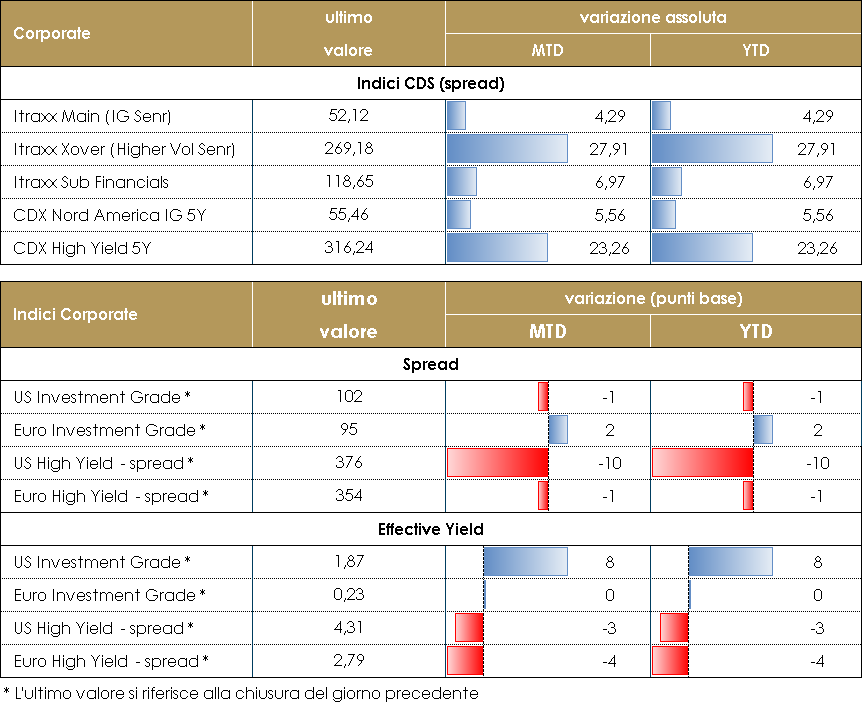 Nell’ultima settimana il mercato corporate è stato caratterizzato da una fase di debolezza derivata principalmente dalle preoccupazioni degli operatori in merito alle nuove varianti della pandemia e dai rallentamenti nelle campagne vaccinali. I timori relativi all’incertezza sugli sviluppi della fase congiunturale sono poi stati ulteriormente evidenziati da alcune trimestrali che pur presentando dati complessivamente migliori delle attese non hanno fornito outlook positivi per l’anno proprio a causa dell’incertezza.I flussi sul mercato sono stati per la prima volta da mesi nel complesso negativi, soprattutto sul mercato secondario e in particolare sui segmenti a maggior beta quali i corporate hybrids.Sul mercato primario, seppur in tono minore rispetto alle prime settimane del mese, sono continuate le emissioni in particolare di emittenti high yield con book molto elevati nonostante la fase di debolezza. Su base settimanale, inclusa la giornata odierna, gli Indici CDS hanno chiuso con un +18bp su Itraxx Xover (Hy)  e  +3 su  Itraxx Main (IG); stessa dinamica, in US, con IG (+4) e HY (+10).Più negativa la settimana sul mercato secondario con gli indici HY in ritracciamento di oltre 0.50% e IG negativi ma supportati da tassi in discesa, in particolare in US.Sul mercato primario settimana con attività in particolare su subordinati Corporate EDP (1.875% perp nc5), Heimstaden Bostad (2.625% perp nc7) oltre al sub T2 di Banque Postale (0.75% 11nc6).Molto attivo anche il comparto HY e not rated con diverse emissioni anche multitranche tra cui Teamsystem (B-, 7y, Fixed 300Mio 3.5%, Frn 850Mio E+375), Thom (NR, 5y Fixed 370Mio 5.375%, Frn 250Mio E+550), CAB – Biogroup (NR, 7y, 800Mio, 3.375%) (Trafigura (NR, 400Mio, 5y, 3.875%).