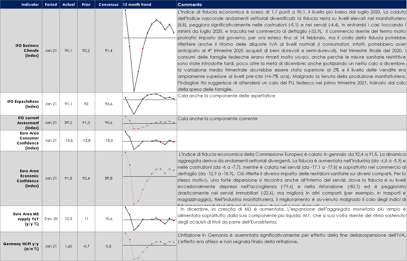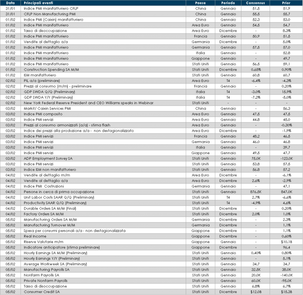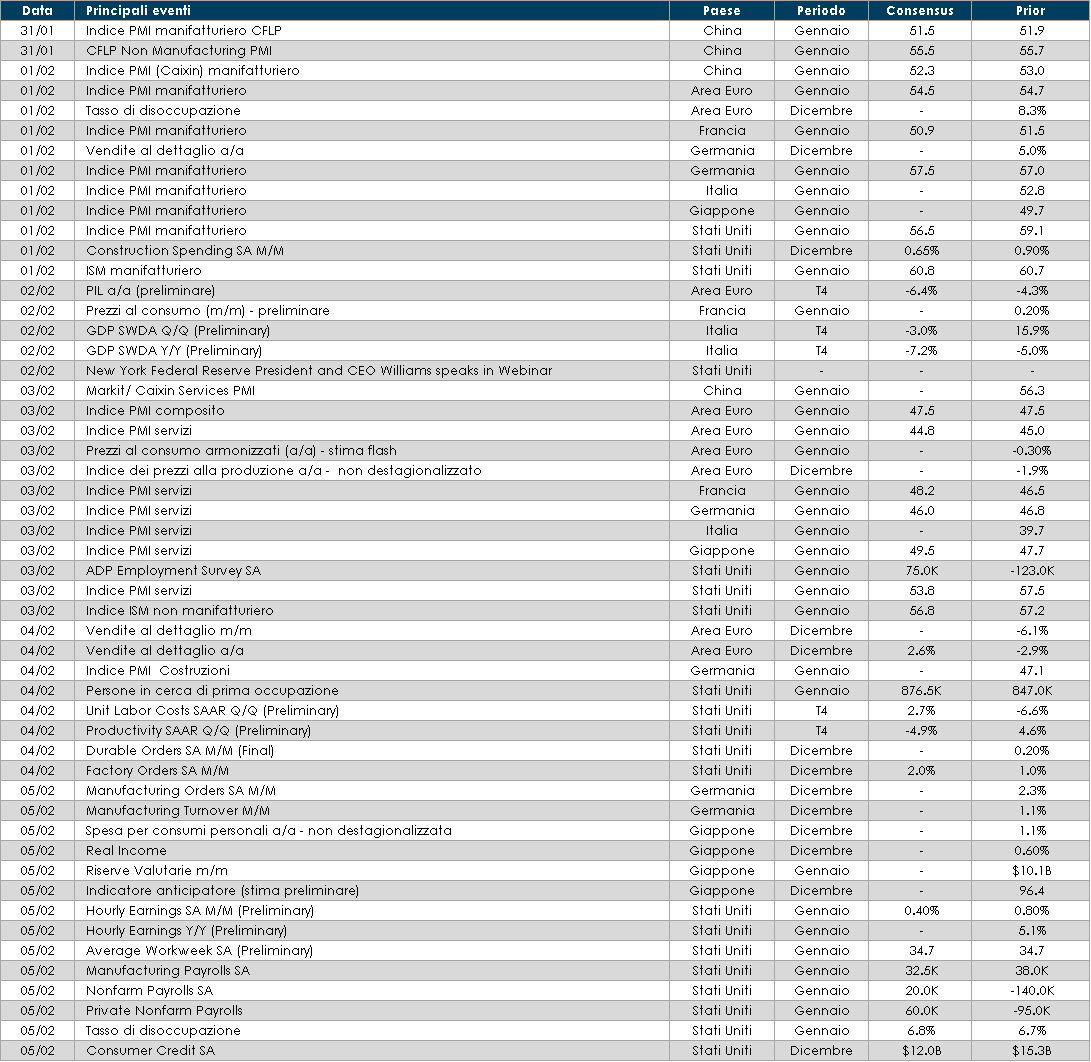 • Europa: in settimana saranno pubblicati i dati definitivi degli indici PMI Markit dei singoli paesi e per l’Area nel suo complesso relativi al mese di gennaio. Sarà pubblicata anche la stima preliminare dell’inflazione di gennaio per l’intera Area Euro. In UK vi sarà lariunione della Banca Centrale, che potrebbe decidere di tagliare i tassi di interesse.