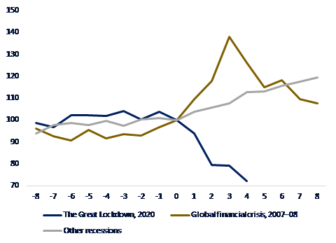 Fig. 4: Bankruptcies (Index, last prerecession quarter = 100)