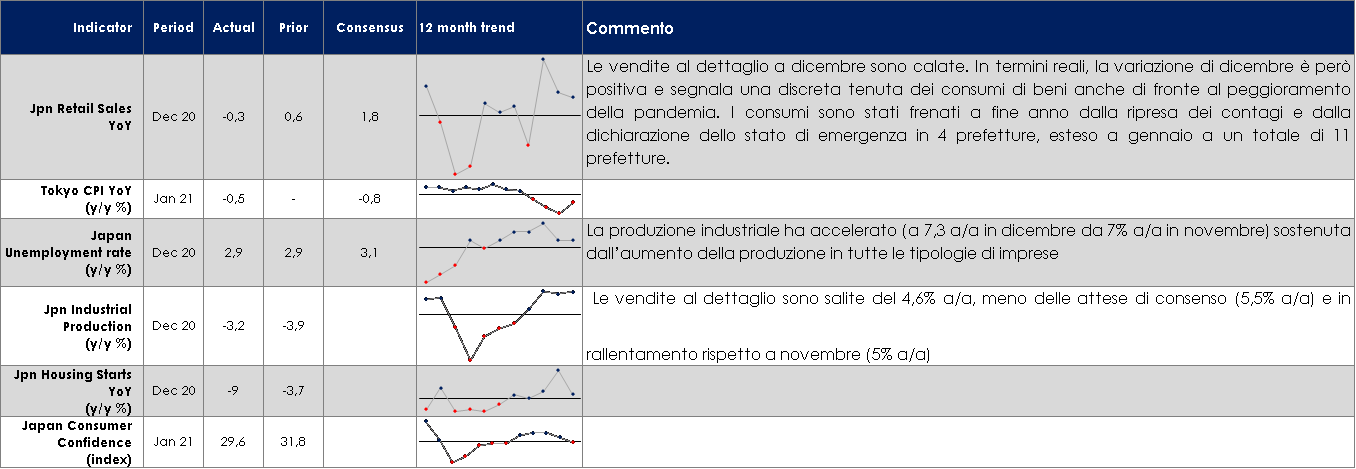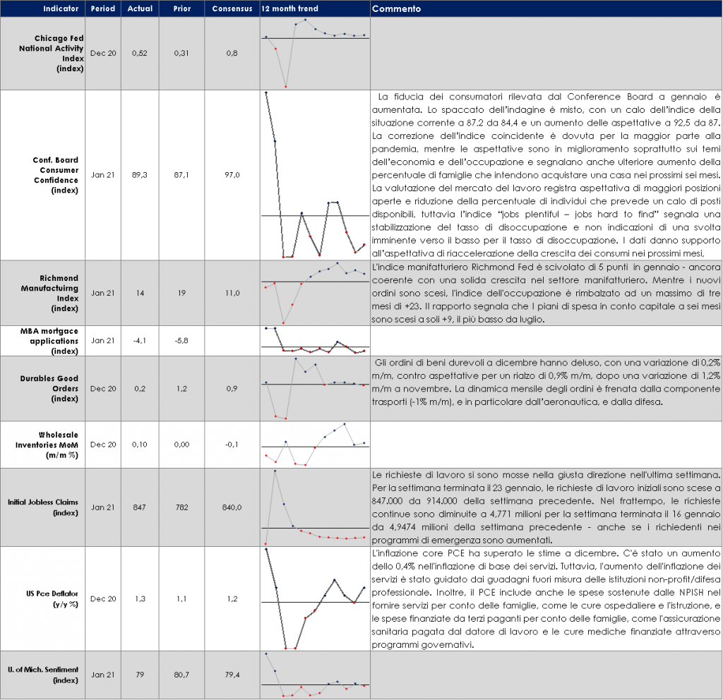La stima preliminare del PIL di T4  registra una variazione di 4% t/t ann., dopo 33,4% t/t ann. dell’estate. La crescita annua nel 2020 si attesta così a -3,5%. La maggior debolezza si può leggere nei consumi, sulla scia della fine dello stimolo fiscale e del deterioramento del quadro pandemico. La spesa delle famiglie è cresciuta del 2,5% t/t ann., dopo +33,4% t/t ann. di T3, con una contrazione di -0,4% t/t ann. per i beni e un incremento di 4% t/t ann. per i servizi. Il rallentamento dei consumi non preoccupa particolarmente, perché le due cause della frenata di fine anno si stanno invertendo, con l’arrivo di nuovo stimolo fiscale e con un evidente miglioramento della situazione dei contagi da metà gennaio in poi. Gli investimenti danno invece segnali molto solidi. Gli investimenti fissi non residenziali sono risultati in aumento di 13,8% t/t ann., con un aumento ecce per i macchinari (24,9% t/t ann., dopo 68,2% t/t ann. dell’estate) e una stabilizzazione per le strutture (+3% t/t ann. dopo 4 trimestri negativi consecutivi). Questo rappresenta un elemento di supporto perla sotenibilità della crescita. Il contributo alla crescita complessiva è di 1,04 pp dalle scort.e Gli investimenti residenziali proseguono sul trend verso l’alto, con una variazione di 33,5% t/t ann. (dopo +63% t/t ann.). La spesa pubblica è risultata in calo di -1,2% t/t ann., con una correzione di -0,5% t/t ann. a livello federale e di -1,7% t/t ann. a livello statale e locale. Le esportazioni sono  risultate in aumento del 22% t/t ann. (dopo +59,5% t/t ann.) con +31,1% t/t ann. per i beni e 4,3% t/t ann. per i servizi. Le importazioni crescono di 29,5% t/t ann. (dopo 93,1 % t/t ann., spinte sia dai beni (30,8% t/t ann.) sia dai servizi (22,2% t/t ann.). Il risultato è un contributo negativo al PIL di -1,5% per le esportazioni nette.