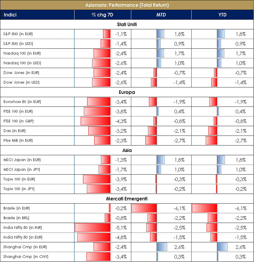 La settimana è stata caratterizzata da un generale clima di risk off sui mercati azionari, che ha impattato anche le valute a più alto beta: mercati emergenti in primis, ma anche le commodity currencies del G10 (Corona Norvegese e Dollaro Canadese in particolare).