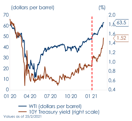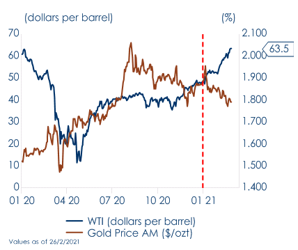 A seguito dell’emergenza gelo in Texas, che con la paralisi delle operazioni estrattive ha fatto lievitare le quotazioni dei combustibili fossili, il prezzo del petrolio è salito sopra i 60 dollari al barile, registrando un nuovo massimo da gennaio 2020. Questa recente accelerazione rientra in un trend al rialzo di medio termine, iniziato in T4 2020 successivamente alla notizia della commerciabilità su larga scala dei vaccini anti-covid e della conseguente rimodulazione delle attese di crescita (e quindi di una domanda in aumento) a fronte di un’offerta di petrolio ancora depressa.