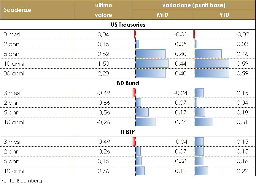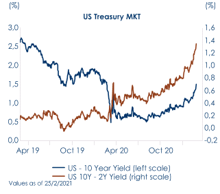 Il mese di febbraio è stato caratterizzato da un marcato reflation trade innescato dalla transizione politica negli Stati Uniti, dalle attese di una politica fiscale più espansiva e da una rimodulazione delle attese di crescita ed inflazione. L’inizio della campagna vaccinale anti- covid e il sostegno fiscale sono stati i principali catalyst i di questo movimento. Questo reflation trade si è tradotto in un marcato aumento dei rendimenti dei principali titoli governativi sulle scadenze a medio e lungo termine. Il movimento si è originato negli Stati Uniti ed ha prodotto un irripidimento della struttura a termine dei Treasury ma si è esteso via correlazione anche all’altra sponda dell’Atlantico: i rendimenti dei titoli di Stato a lungo termine dell’Area Euro hanno subito un significativo incremento, pur permanendo su livelli complessivamente contenuti. La struttura a termine governativa tedesca si è irripidita, non solo nel segmento10s30, ma anche nel segmento 2s10quasi a sfidare la promessa della BCE di mantenere condizioni di finanziamento accomodanti. E, nonostante i dati macro mostrino un ritardo della crescita economica dell’Area Euro rispetto agli Stati