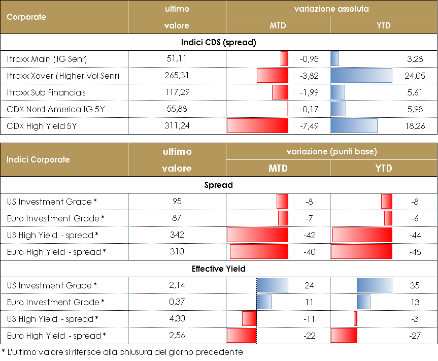 La settimana è stata piuttosto difficile per i mercati del credito a partire dal movimento dei tassi reali che nella settimana hanno proseguito il trend di rialzo nonostante le parziali rassicurazioni delle autorità monetarie sul proseguimento delle politiche espansive sia in termini di tassi bassi a lungo che sui programmi di acquisto diretto. L’allargamento degli spread, soprattutto nella seconda parte della settimana, ha pesato sul total return degli indici, già sostanzialmente negativi per l’irripidimento delle curve e per l’aumento dei tassi soprattutto nella parte medio lunga della curva. Le emissioni brevi risultano invece piuttosto ancorate grazie comunque alla forward guidance confermata dalle autorità.Sul mercato secondario i titoli corporate bond hanno sofferto in particolare nelle parti medio lunghe delle curve anche degli strumenti subordinati con call oltre i cinque anni.Gli indici CDS di cui riportiamo settimanalmente Itraxx Xover e CDX HY rispettivamente su Europa e US, hanno fatto segnare +21bp in Europa e +20 negli Stati Uniti. Più moderato l’allargamento degli indici IG con CDX IG  e Itrxx Eur Main in allargamento di 5bp.Sul primario il tono negativo della settimana ha contribuito a raffreddare l’attività anche se da parte delle società l’aumento dei tassi porta inevitabilmente ad una accelerazione nei programmi di funding per l’anno.Su corporate segnaliamo i double tranche di ENBW (7y e 12y 500MIo), NTT Senior (4y e 9y 1Bio each), Glencore (8y e 12y 500Mio) e i deal di Easyjet (BBB- 1.2Bio 1.875%) che ha attratto domanda per 5 volte (6Bio) e General Motors (6y 750Mio 0.6%).Su HY deal di refinancing per Victoria (500Mio 5.5y nc 2, 3.625%) mentre più tranquilla la settimana sulle emissioni bancarie con emissioni senior per Natwest, BNP e BPCE.