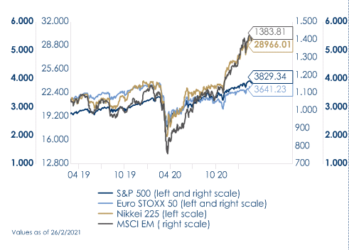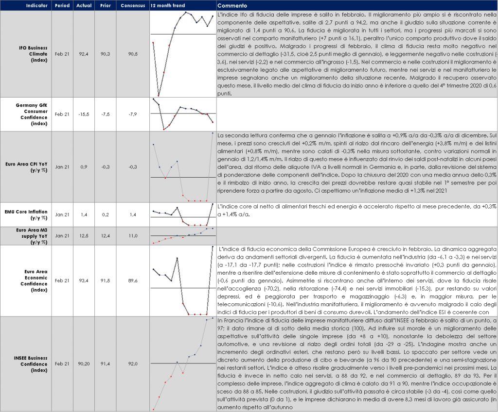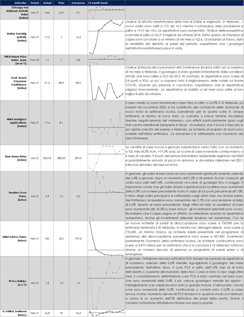 Febbraio può essere ricordato come il mese del “reflation trade” e della tornata speranza per un rollout vaccinale, con le small cap in sovraperformance, l’oro e i long duration in sofferenza. Di insolito si segnala come per la prima volta gli EM non abbiano seguito l’andamento in correlazione al reflation trade verificatosi. Petrolio e rame le top commodities. Infine, nel mese di febbraio si ricorda la pressione inflattiva sulla “produzione” dei PMI e la riduzione del rischio Italia dopo l’insediamento di Draghi al Governo. In termini di performance mensili, le Banche (+19%) hanno trainato la performance dell’indice europeo SXXE (+3.90%) insieme ad Insurance, Travel&Leisure e BasicResources +8%, contro Utilities -5%. Mercato italiano in forte rialzo post-Draghi (FTSE MIB +8.30%). S&P500 a +3% da inizio mese e Nasdaq100 debole a +0.70% (Tesla -14%). Vaccinazioni da Covid-19: Israele al 51%, UK 28%, USA 14%, EU 4-5%.