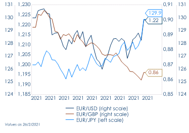 I mercati stanno forzando questa posizione: nelle ultime due settimane i tassi reali USA sono saliti di quasi 40pb. Solitamente un movimento superiore a 20pb in un periodo di tempo così breve causa tensioni nelle valute dei ME. Questa volta non fa eccezione: un buon numero di valute dei ME ha sofferto contro l’USD. Nell’Area Euro (AE) la BCE è apparsa meno incline ad aumentare il sostegno monetario. L’attenzione del mercato si è spostata verso la politica fiscale: la differenza tra USA e AE è evidente. Negli USA lo stimolo raggiungerà quasi 3tr$ nel 2021, mentre in AE, la somma del Recovery Fund e degli stabilizzatori automatici resta inferiore a 1tr €. L’ AE è in ritardo nella corsa globale per uscire dallo shock pandemico. L’aumento dei tassi reali in AE ha spinto diversi alti funzionari della BCE, tra cui C. Lagarde, ad esternare preoccupazione per il movimento, senza riuscire però a far cambiare idea agli investitori fino ad ora. L’euro sembra destinato ad apprezzarsi sia contro USD che contro JPY