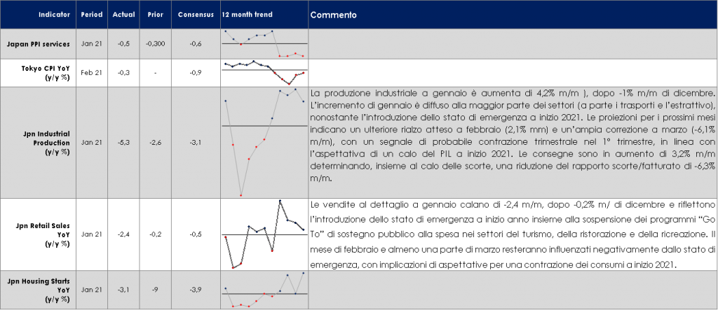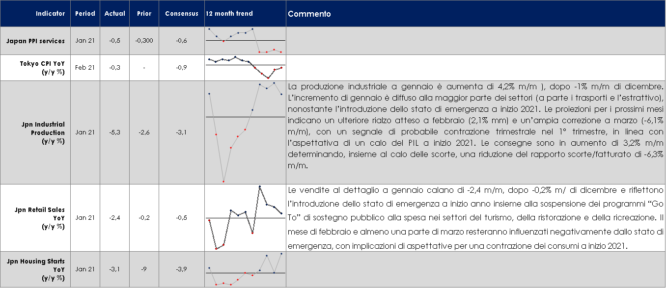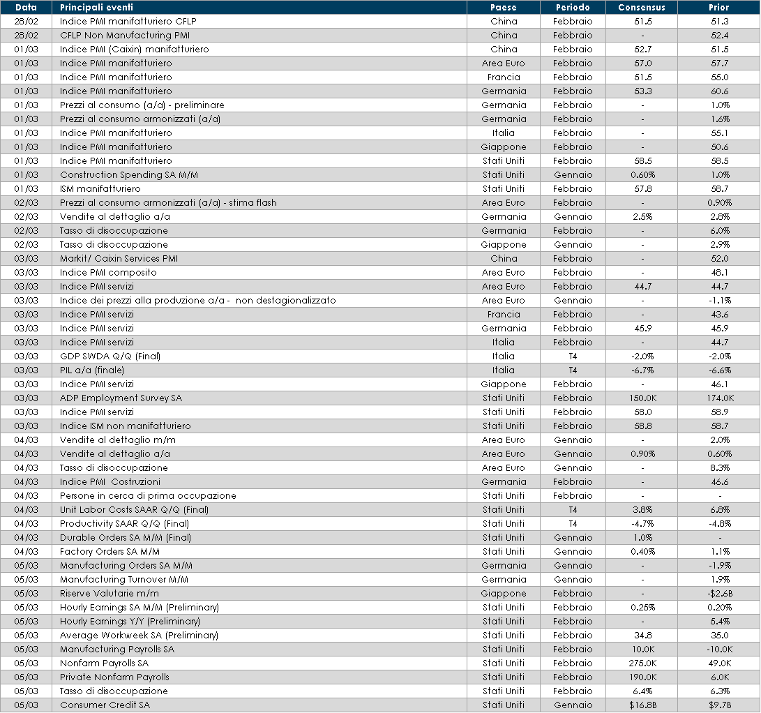 • Stati Uniti: I dati statunitensi della prossima settimana confermeranno probabilmente la ripresa in corso, anche se le rigide temperature registrate in questi giorni rischiano di introdurre rumore nei dati. Saranno infatti pubblicati gli indici PMI manifatturieri e dei servizi nonché il report sul mercato del lavoro. Mercoledì sarà pubblicato il Beige Book, documento economico su cui deciderà il FOMC del 17 marzo.
