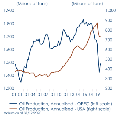 L’offerta, invece, non si è adattata così velocemente. Nel 2020 l’offerta di petrolio ha seguito le fluttuazioni drastiche della domanda. A fronte del crollo del prezzo del greggio registrato in marzo a seguito del fallimento dei colloqui OPEC e di una grave frattura tra Russia e Arabia Saudita, ad aprile l’OPEC+ ha deciso un taglio della produzione di quasi 10 milioni di b/g tra aprile e giugno, per poi incrementarla gradualmente di 2 milioni di b/g nel corso dell’estate. A dicembre l’OPEC+ ha accettato un ulteriore incremento di produzione di 500.000 b/g, circa un milione di b/g in meno rispetto alla proiezione prevista nel deal originale per via dell’outlook economico globale nuovamente in peggioramento a seguito della seconda ondata di infezioni. A gennaio l’Arabia Saudita si è fatta carico unilateralmente di un taglio della propria produzione di 1 mb/d nei mesi di febbraio e marzo a fronte di un modesto aumento della produzione di Russia e Kazakistan per soddisfare il fabbisogno stagionale. Il prossimo meeting OPEC si terrà il 4 marzo. Le attese, tuttavia, sono per una riconferma della strategia di rimodulazione dei tagli, già decisa in precedenza. La produzione di shale-oil USA è rimasta anch’essa depressa e ha subìto un calo marcato nel corso del 2020. Le prospettive per il 2021 sembrano compromesse dai forti tagli agli investimenti, penalizzati dalla necessità di consolidamento dei bilanci per le imprese che sono sopravvissute al 2020. A questo si deve aggiungere il cambio di passo dell’amministrazione statunitense. Il neopresidente Biden che, tenendo fede alle promesse elettorali fin dal suo insediamento, ha varato una serie di provvedimenti che non giocano a favore dei combustibili fossili e che renderanno difficile la ripresa dell’industria estrattiva dello shale-oil.