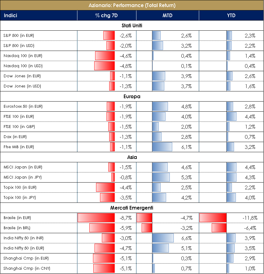 Mercati azionari negativi questa settimana con l’indice europeo SXXE a -1.60%, trainato dalla speranza di riaperture nel settore Travel&Leisure +3.40% (Lufthansa +12%, Airbus +5%), Insurance +2.50%, Energy +1.95% (Tenaris e Technip +17%, Total ed ENI +4%) e Banks +1.80% (BNP +3%); di contro si registrano le vendite nel comparto Tecnologia -4.30% (Adyen -13%). Dato il movimento generalizzato di steepening delle curve dei rendimenti e l’annessa e connessa minaccia per i mercati azionari, con valutazioni ai massimi, può diventare strategico il posizionamento su settori la cui performance è correlata negativamente all’aumento dei tassi d’interesse: l’indice EuroStoxx Banks ha registrato un +6% in settimana; anche i settori dell’energia e delle materie prime favoriti dalla reflazione; sovra-performa anche dell’indice EuroStoxx Oil&Gas, che è salito di quasi il 5%, grazie all’aumento delle quotazioni del petrolio. Brent e WTI vicini ai $66 e $63 al barile, sui massimi da gennaio 2020, grazie anche ad una serie di eventi che hanno accelerato il rally innescato dalla scoperta dei vaccini Covid-19, dal taglio della produzione unilaterale dell’Arabia Saudita e il gelo americano. Appuntamento posticipato al 4 marzo in occasione dell’OPEC+! In linea generale gli investitori sembrano temporeggiare in attesa di capire quando si fermerà il rialzo generalizzato dei rendimenti obbligazionari, giunti ai nuovi massimi da febbraio 2020. In settimana è arrivato inoltre il supporto di Jerome Powell tramite il suo intervento al Congresso con il quale ha ri-confermato il pieno sostegno della FED all’economia americana, ancora fragile e lontana dall’obiettivo di piena occupazione, allontanando ogni dubbio sul possibile rialzo dei tassi. L’indice VIX è salito negli ultimi giorni, seppur ancora sotto quota 30, mentre la curva dei futures non si è invertita, a segnalare che gli operatori non si aspettano un sell-off a breve sul comparto. Storia simile oltreoceano, S&P500 a -2% con i settori Agri&Farm a +16%, Airlines +8% contro Comp&Elect -14%; Nasdaq100 -4.30%, con Marriott a +14%.