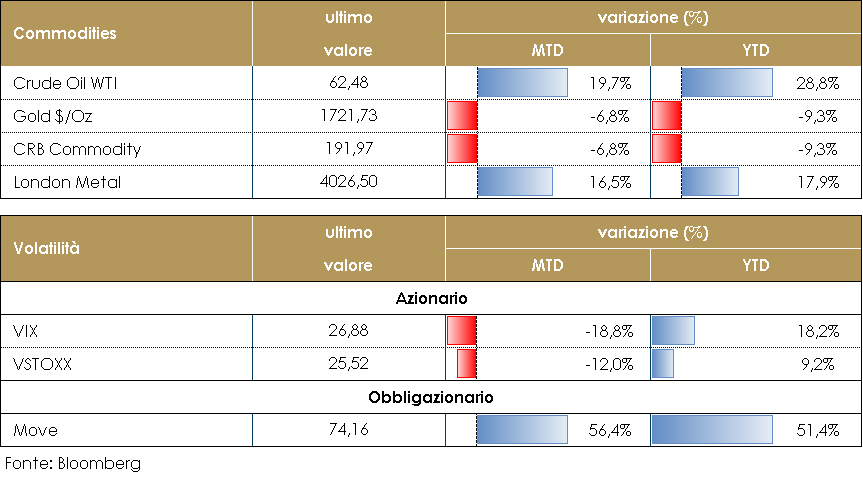 Il prezzo delle materie prime si conferma in accelerazione in scia al forte rialzo del petrolio (cfr. Il punto della settimana). Il Bloomberg Commodity Spot Index, che tiene traccia dei movimenti dei prezzi di 23 materie prime, è salito ai massimi da marzo 2013. I guadagni sono stati spinti dal prezzo del rame (leading indicator della domanda globale), salito sopra i 9.000 dollari a tonnellata per la prima volta in nove anni e da quello del petrolio mentre il caffè e lo zucchero sono cresciuti in maniera più contenuta.