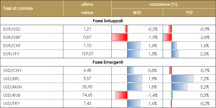 All’inizio di febbraio l’USD si è apprezzato nei confronti di tutte le valute G10, registrando i maggiori guadagni nei confronti di EUR e CHF, valute che offrono i rendimenti più bassi a livello globale. Gli investitori hanno messo in discussione la visione di un indebolimento dell’USD guidato da politiche monetarie e fiscali accomodanti. Sebbene l’USD sia stato più forte delle attese, il sentiment di mercato è rimasto favorevole al rischio sostenendo alcune valute dei ME nei confronti dell’USD. Nella seconda metà del mese, l’USD ha iniziato a deprezzarsi contro tutte le valute del G10. J. Powell ribadendo che il mercato del lavoro è lontano dalla piena occupazione e l’aumento atteso del tasso di inflazione nei prossimi due mesi sarà temporaneo ha dichiarato che la FED guarderà al picco senza prendere alcuna misura.