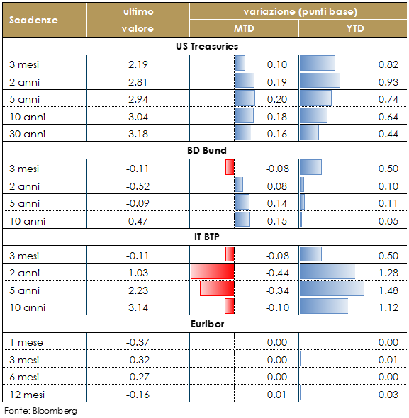 In Francia, l’indice di fiducia delle imprese manifatturiere elaborato dall’INSEE ha registrato un calo più forte del previsto a 107 (consenso 109, valore precedente 110). Lo spaccato dell’indice mostra un calo della produzione corrente, ma anche un brusco calo degli ordini sia domestici sia esteri, che registrano un minimo da dicembre 2016. Parte del calo è spiegato dalla riduzione delle scorte di magazzino. Il dato di settembre conferma il rallentamento del settore manifatturiero francese, dopo un primo semestre piuttosto buono (+1.8% a/a medio) e due mesi, luglio e agosto, di crescita vigorosa. In rallentamento anche l’indice IFO in settembre a 103.7 (consenso 103.2, valore precedente 103.9), restando comunque ad un livello coerente con una crescita economica tedesca sopra il 2% L’indice delle condizioni attuali è rimasto invariato ad un livello elevato pari a 106.4 (da 106,5), mentre le aspettative sono diminuite solo leggermente a 101 (da 101.3). La scomposizione per settore conferma il risultato di altre indagini secondo cui il rallentamento rispetto al forte ritmo di crescita dello scorso anno riflette gli sviluppi nel settore manifatturiero, mentre il settore dei servizi mantiene una fiducia su livelli elevati (a 32.5, invariato rispetto al valore di agosto), riflettendo presumibilmente la forza dell’economia nazionale e del mercato del lavoro. Il commercio beneficia di consumi solidi con l’indice di fiducia per il commercio al dettaglio che a settembre è avanzato a 5.1 da 1.3. In calo anche l’indice aggregato Economic Sentiment Indicator (ESI) per l’intera Area Euro sceso a 110.9 da 111.6 del mese precedente. Il declino dell’ESI da 111.6 a 110.9 è il nono calo consecutivo, che porta l’indice al livello più basso da 15 mesi. In settembre l’inflazione headline per l’intera Area Euro è aumentata 2,1% a/a dal precedente 2,0% a fronte di un rallentamento dell’inflazione core, sceso a 0.9% dal precedente 1.0%. Pertanto l’aumento dell’inflazioneheadline riflette interamente l’aumento dell’inflazione alimentare e energetica. Guardando alla scomposizione per paesi, il dato risente del robusto incremento dell’inflazione tedesca (2,2% a/a armonizzato da 1,9% a/a del mese precedente) controbilanciato dal rallentamento del CPI francese (2,5% a/a dal 2,6% a/a del mese precedente) e italiano (1,6% a/a come ad agosto).