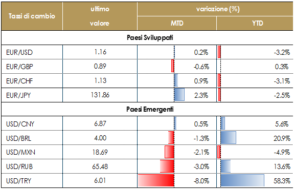 La BoJ ha pubblicato i verbali della riunione del 31 luglio, che aveva visto molte modifiche, fra cui l’introduzione della forward guidance sui tassi e della flessibilità negli acquisti di JGB e allargato l’intervallo di fluttuazione dei rendimenti a lungo termine. I verbali riportano che la maggior parte dei membri del Comitato ritiene appropriato mantenere lo stimolo monetario “in modo persistente”, anche se alcuni membri sottolineano l’importanza di monitorare gli effetti collaterali delle misure in atto. Alcuni membri pensano che sia opportuno attuare uno stimolo prolungato e ritengono che la forward guidance sia utile per contrastare le aspettative di uscita. Sull’intervallo di fluttuazione dei rendimenti un membro ritiene adeguato un range di 0,25% e un altro pensa che non sia necessario impedire fluttuazioni di segno negativo. Nel complesso i verbali non modificano la valutazione delle modifiche attuate a luglio, che rispecchia l’obiettivo di allentare la politica monetaria il più possibile e di convincere il mercato che la svolta è ancora lontana. Kuroda recentemente ha ripetuto che il raggiungimento dell’obiettivo di inflazione richiede più tempo di quanto atteso. Pertanto, il governatore della BoJ ha ribadito che la banca centrale prosegue con il “potente” stimolo monetario e che non c’è una tempistica già definita riguardo alla sua durata. Per questo, secondo Kuroda, è particolarmente importante l’impegno a mantenere i tassi sui livelli attuali, estremamente bassi, per un periodo prolungato, pur riconoscendo che ciò non implica tassi a questi livelli per sempre. La BoJ continuerà a tenere sotto controllo il funzionamento del mercato dei JGB. La produzione industriale giapponese è tornata ad aumentare in agosto (0,7% m/m) in agosto, riportando il primo aumento in quattro mesi (consenso dell’1,5% m/m, valore precedente -0,2% m/m). Il valore di agosto è stato guidato dalla produzione dei mezzi di trasporto, attrezzature di produzione generale e materie plastiche. Il forte rimbalzo delle spedizioni ha ridotto le scorte per il terzo mese. Le spedizioni di beni capitali sono aumentate (implicazioni positive per la spesa in conto capitale). In Cina il rapporto Beige Book ha evidenziato che le imprese erano in difficoltà già prima dell’implementazione dei dazi statunitensi, come indicato dal marcato aumento dei prestiti alle società, confermando così che il rallentamento della Cina è dovuto sia alle tensioni commerciali sia alla riduzione della leva finanziaria In particolare difficoltà versa il settore manifatturiero.