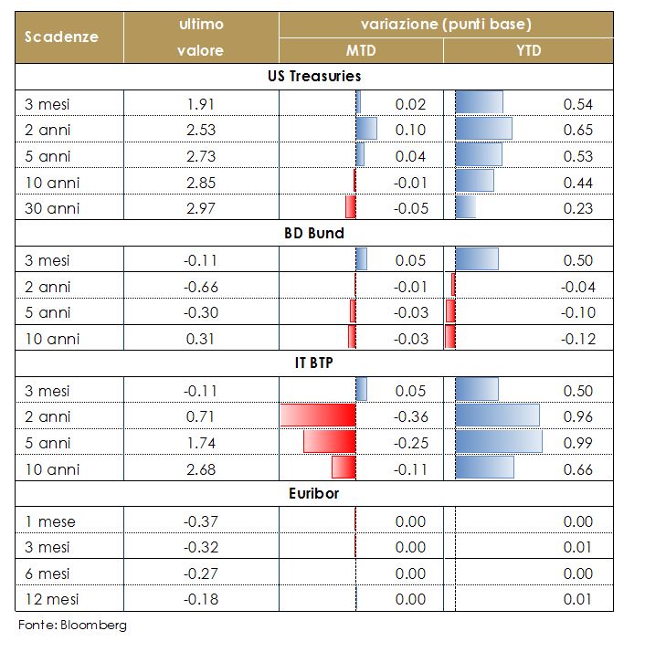 In giugno l’indice di fiducia economica dell’Area Euro si è attestato a giugno a 112.3 punti (consenso: 112, valore precedente 112.5). Guardando alle singole economie, in Germania l’indice IFO si è attestato a 101.8 punti, in linea con le attese A cedere è stata la valutazione sulla situazione corrente, passando a105,1 da un precedente 106,1, minimo dal maggio 2017. Le attese, invece, sono rimaste stabili a 98,6. Lo spaccato settoriale mostra un calo del clima di fiducia diffuso a tutti i settori. La fiducia rimane ancora al di sopra della media di lungo termine e coerente con una crescita ancora positiva dell’attività anche se a ritmi più blandi che a aprile e maggio. In Italia, i dati principali riguardano la fiducia dei consumatori e delle imprese del mese di giugno, mese che ha visto aleggiare le preoccupazioni connesse alle prime prese di posizione del nuovo governo gialloverde e al tema dei dazi a livello internazionale. L’indice di fiducia delle imprese manifatturiere è in flessione a 106.9 punti dopo i 107.7 di aprile, mentre la fiducia dei consumatori batte il consenso salendo a 116.2 punti dai 113.7 di maggio. La stima preliminare sull’inflazione mostra un accelerazione a 2.0% a/a della componente headline (mese precedente 1.9% a/a), a fronte però di un rallentamento all’1.0% a/a della componente core,sottolineando che fino ad ora l’aumento dell’inflazione è dovuto principalmente al rimbalzo della componente energetica.