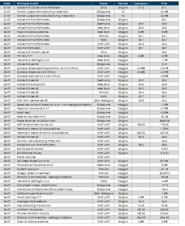 - Stati Uniti: attese per il report sul mercato del lavoro e sull’indice ISM manifatturiero di giugno. Inoltre sarnno pubblicate le minute dell’ultimo FOMC
