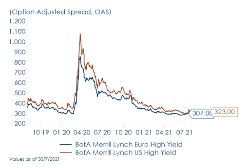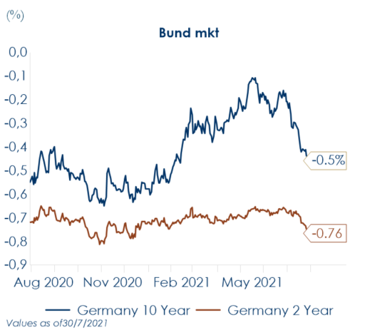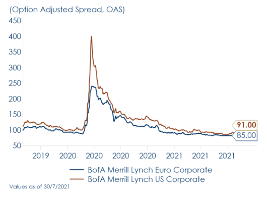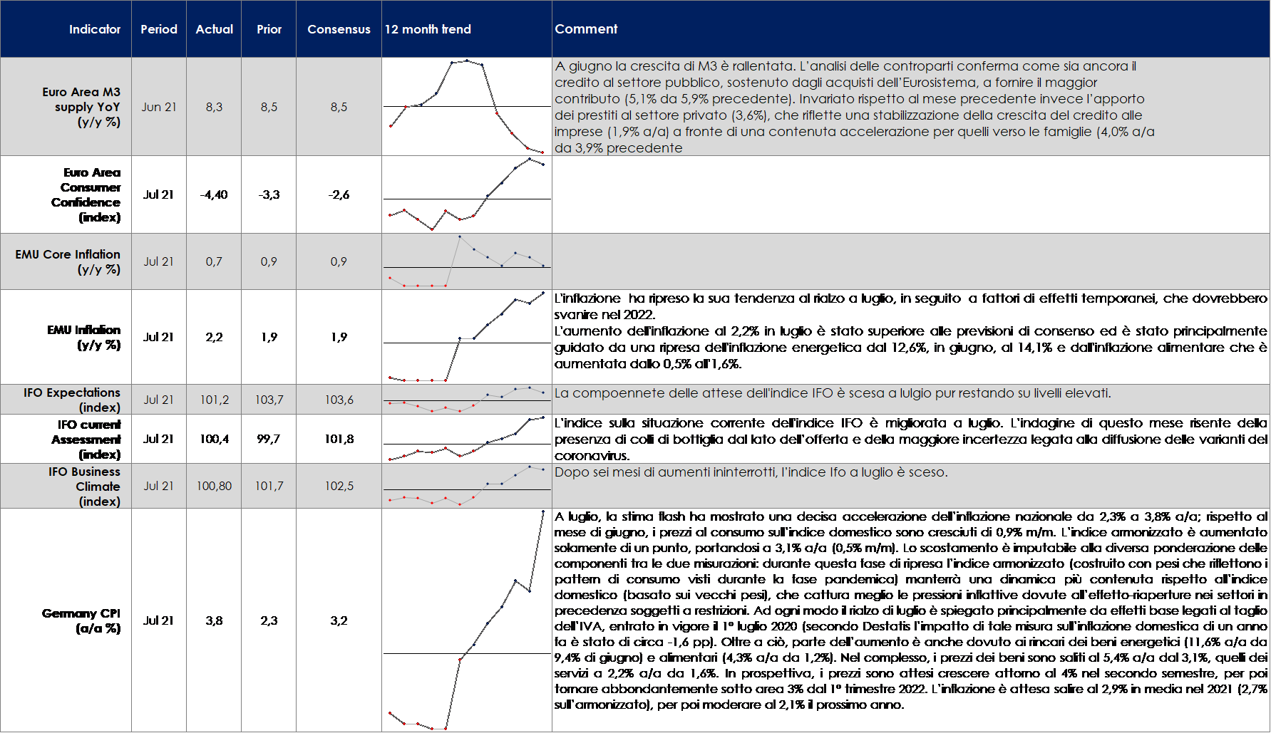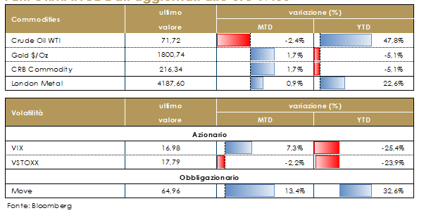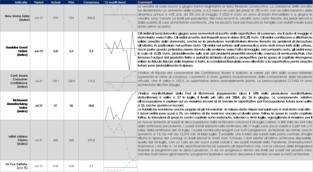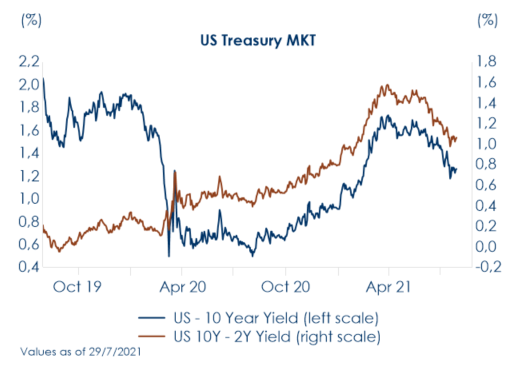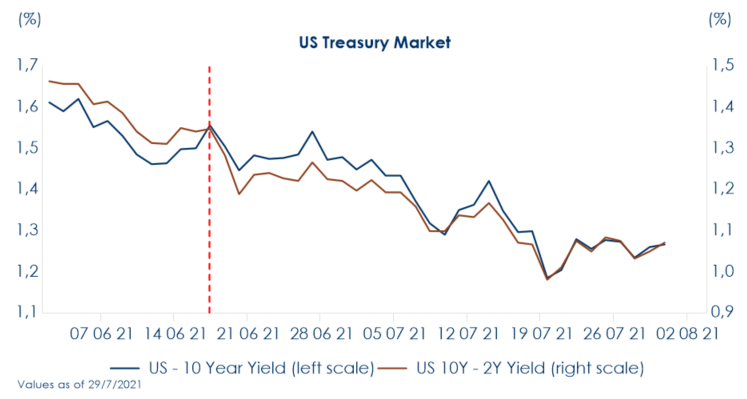 Durante il mese di luglio, gli investitori hanno continuato ad interrogarsi se l’aumento dell’inflazione si rivelerà temporaneo e se la variante delta del Covid ritarderà la transizione verso un mondo post-pandemico, rallentando la crescita globale. Da un lato l’inflazione negli USA, misurata sull’indice CPI, è aumentata nel secondo trimestre del 10,6% ad un ritmo annualizzato rispetto al primo trimestre dell’anno in corso. Dall’altro, il mercato ha temuto un peggioramento nelle prospettive di crescita: la pubblicazione di un ISM non manifatturiero inferiore alle previsioni negli Stati Uniti, il taglio del RRR da parte dell’autorità cinese per sostenere alcuni settori della sua economia e la continua diffusione della variante Delta sono state tra le ragioni alla base di questi timori. Un movimento di risk-off si è instaurato nei mercati.