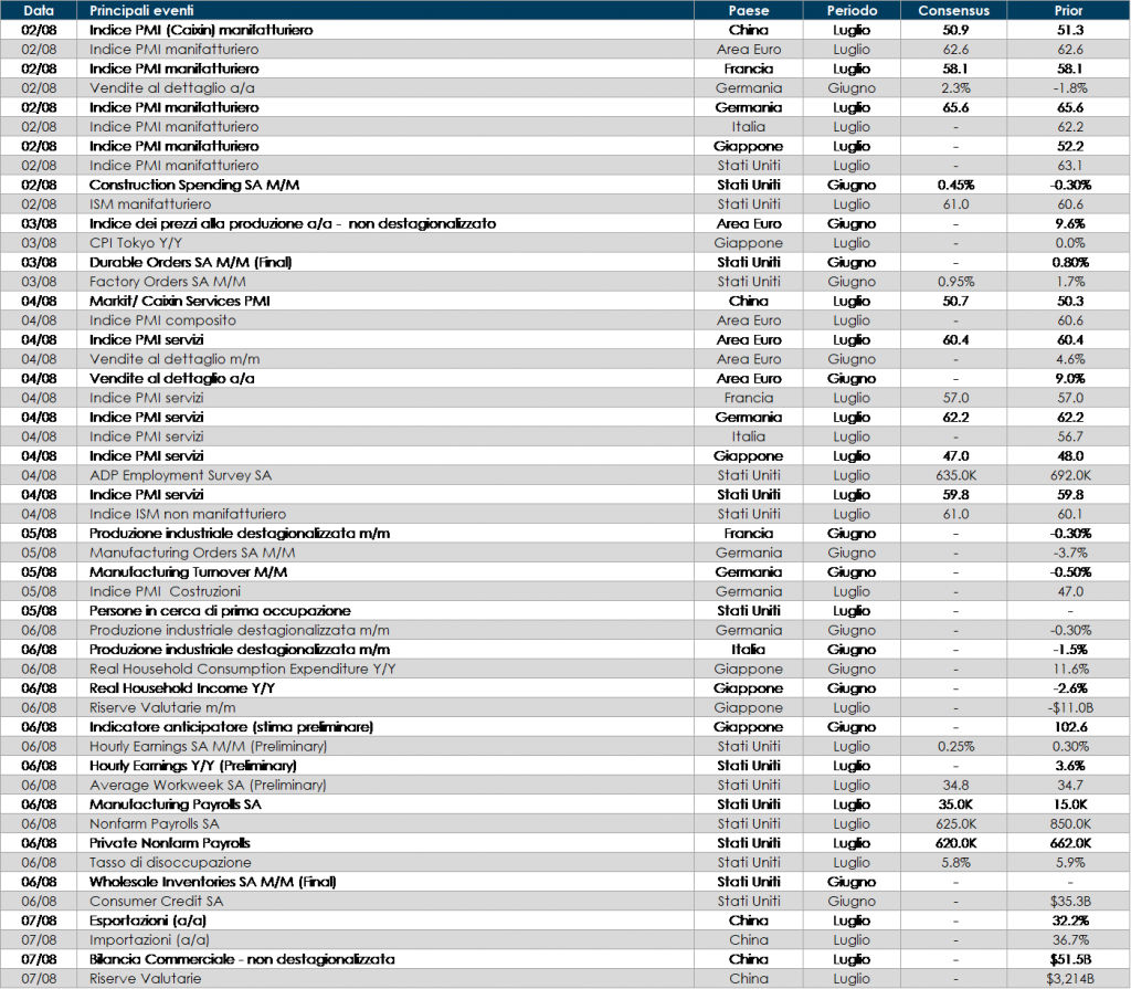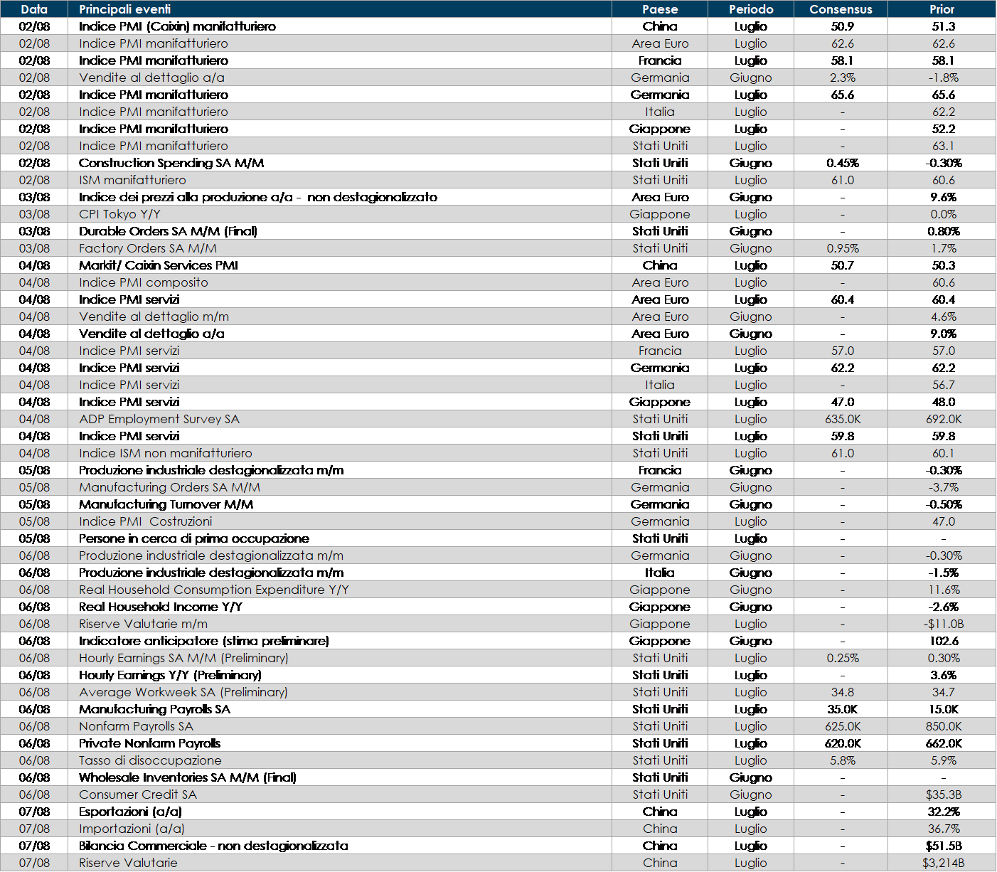 - Stati Uniti: l’attenzione sarà rivolta al report sul mercato del lavoro relativo al mese di luglio. Inoltre, sarà pubblicato l’indice ISM manifatturiero e gli indici PMI di -Markit;