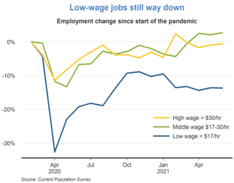 L’altra sorpresa positiva di questo FOMC è stata l’esclusione della variante delta del virus dai rischi al ribasso per la crescita economica. Secondo Powell, l’impatto economico di ogni successiva ondata di Covid sarà minore di quella precedente. Comunque, resta una remota probabilità che la variante Delta ritardi l’inizio del tapering. Se lo fa, avverrà molto probabilmente sul mercato del lavoro in modo molto più lento del previsto. Riguardo proprio al mercato del lavoro, Powell ha ribadito che il “mercato del lavoro ha ancora della strada da fare”. Il tasso di disoccupazione totale ha raggiunto il 5,9%, ma il tasso di occupazione non è risalito dai livelli bassi dell’anno scorso, specialmente per le fasce più deboli della popolazione (Fig.2). “Vorremmo vedere numeri forti sul lavoro”, ha aggiunto Powell, che ha ricordato come l’obiettivo di “massima occupazione” non possa essere ridotto a un singolo dato.