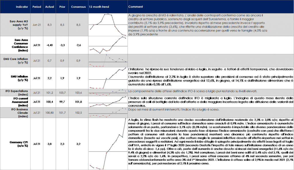 - Europa: la settimana prossima saranno pubblicati gli indici PMI relativi al mese di luglio sia per l’Area nel suo complesso sia per i singoli paesi;