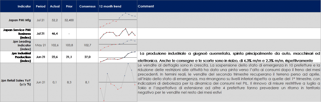 ASIA: in Giappone i principali dati di attività di giugno danno indicazioni positive, ma le prospettive per la crescita del 2° trimestre sono soggette a rischi verso il basso, alla luce del nuovo peggioramento dei contagi e della reintroduzione di misure restrittive per contenere la diffusione di Covid.