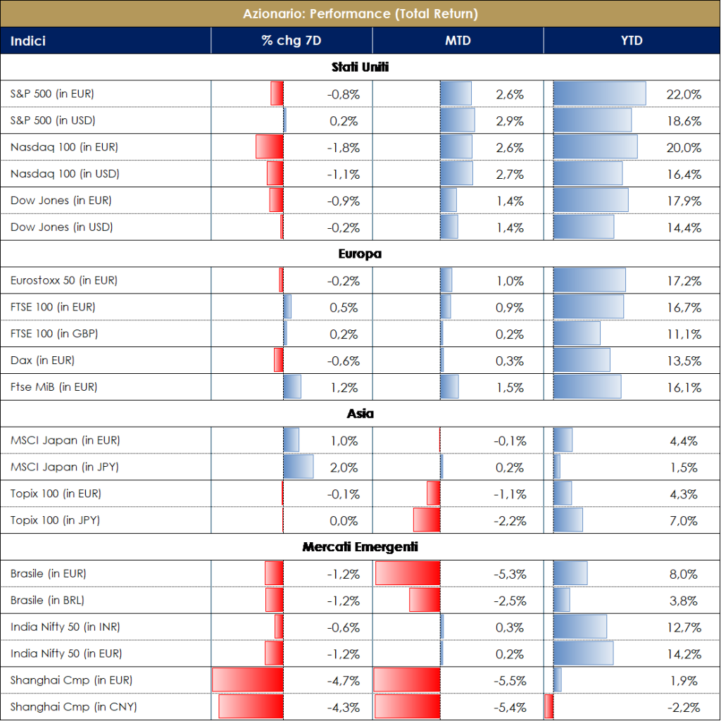 Reporting season da oro olimpico, arbitra Powell Indici US S&P e DJ chiudono la settimana sostanzialmente flat/leggermente in flessione, Nasdaq -1%. Dati macro permangono supportivi, si attenuano i timori di una ripresa rapida dell’inflazione e la politica monetaria rimane accomodante. La Fed ha bisogno ancora di tempo per valutare l’evoluzione dei dati prima di avviare il processo di tapering. Intanto si segnala la votazione del senato US a favore dell’apertura del dibattito sul pacchetto per le infrastrutture per circa 1 tln di dollari distribuire su 5 anni. Anche l’Europa resiliente con indice STOXX600 sostanzialmente invariato e trainato nella settimana da Basic Resources +5%, Banks e Energy +2%. Value in lieve ripresa sul Growth (+1%). Settimana turbolenta per i mercati asiatici con HK e Cina in tentativo di recupero negli utlimi giorni di borsa in seguito ad una call organizzata da China Securities Regulator con gli executives delle maggiori banche di investimento nel tentativo, di alleviare i timori del mercato sul recente giro di vite di Pechino sull’industria dell’istruzione privata. Il sell-off visto ad inizio settimana non è piaciuto né alle autorità né ai media statali che lo hanno definito eccessivo. Materie prime, Consumer discretionary e healthcare Tecnologia sono i settori con maggior EPS beat, Information technology e consumer staples quelli con minor beat. Le società maggiormente diversificate a livello globale hanno registrato i migliori risultati in termini di EPS, mentre le società con un’elevata esposizione ai mercati emergenti hanno registrato i risultati più deboli. Dalla reporting season emerge forte crescita del mercato US. Tra i best names europei (STOXX600) della settimana si segnala Alten (+17%), Sabadell e Arcelor +10%, contro Adecco (-15%); Idorsia e Reckitt (-12%); sul mercato principale italiano (FTSE MIB 1.2%) troviamo Unicredit +6.5%, Fineco +6% e Leonardo +5%, mentre su quello delle Mid Cap (ITAMID +2%) Biesse +15%, Tiscali +14% e Danieli +10%. Update della reporting: tra i BEAT troviamo Amundi, Anima, Airbus, ArcelorMittal, Arkema, Banco Sabadell, Bic, Cellnex Telecom, Danone, Indra, Elis, Europcar, Informa, JCDecaux, Jeronimo Martins, Metro, Relx, Royal Dutch Shell, Sage Group, Sanofi, ServiceNow, Solvay, Sopra Steria Group, SPIE, STM, Telenet, Teleperformance, Vivendi, Volkswagen, L’Oreal, Kering, Capgemini, Alphabet, Atos, Bureau Veritas, CNP Assurances, DWS, EDP Renovaveis, Elia, Eurazeo, First Quantum Minerals, Imerys, ITV, M6, Maisons du Monde, Man Group, Microsoft, Moncler, Nexans, Nexity, Santander, SCOR, Smurfit Kappa Group, Telefónica Deutschland, TF1, Visa, LVMH, Unicredit; tra i MISS invece ACS, Carrefour Brasil, CGG, Equinor, Telecom Italia, Unicaja, Air Liquide, ABI, Credit Suisse, HeidelbergCement, Nestlé, PayPal, Telefónica, United Rentals. A cura del team Equity di MB SGR PERFORMANCE MERCATI AZIONARI – Dati aggiornati alle ore 17.30 del 30 luglio 2021 VIEW STRATEGICA I dati sull’efficacia dei vaccini hanno innescato una nuova fase di aumento della propensione al rischio. Le componenti forward looking dei principali indicatori anticipatori hanno accentuato la loro accelerazione e i listini azionari hanno reagito con una riduzione dei premi al rischio, un deciso rialzo delle quotazioni e una rotazione settoriale, anche grazie agli ottimi risultati a livello micro. |