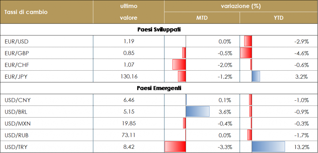 Il prezzo del petrolio resta sopra i 70 dollari al barile sostenuto dalla contrazione delle scorte settimanali statunitensi. Il mercato delle commodities ha beneficiato del meeting del FOMC che ha segnalato di aver iniziato il dibattito sul tapering rinviandolo però più avanti. Questo scenario dovrebbe frenare l’apprezzamento del dollaro e avere conseguenze positive su tutte le commodity, i cui derivati sono espressi nella valuta statunitense e beneficeranno dell’indebolimento della stessa. Un quadro che viene rafforzato dal dato positivo del PIL USA, che consentirà alla Fed di temporeggiare senza che però venga messa in dubbio la ripresa economica domestica e quindi la conseguente domanda di materie prime. I dati settimanali rilasciati dal Dipartimento dell’Energia hanno evidenziato una contrazione delle scorte, a un livello più ampio delle attese: in particolare, gli stock di greggio solo calati di circa 4 milioni di barili rispetto ai -2,4 milioni stimati dal consenso, mentre le scorte di benzine sono scese di 2,2 milioni di barili (vs. -1,1 milioni del consenso). PERFORMANCE – Dati aggiornati alle ore 17.30 del 30 luglio 2021 TASSI DI CAMBIO L’incontro del FOMC è stato l’evento principale per il mercato FX. Le parole usate dal presidente Powell durante la conferenza stampa, sono state sufficienti per convincere gli operatori di mercato che l’incontro di Jackson Hole non sarà utilizzato dalla FED per introdurre maggiori dettagli sul tapering. La novità è risultata essere una sorpresa dovish e ha contribuito a un improvviso arresto dell’apprezzamento del dollaro. Il dollaro ha perso contro tutte le valute del G10. I migliori sono stati la corona svedese (+1,4%), la sterlina britannica (+1,4%) e il franco svizzero (+1,3%). Le commodity currencies, pur guadagnando contro il biglietto verde, sono state le peggiori: Il dollaro australiano ha guadagnato solo lo 0,1%, mentre il dollaro canadese +0,8%. Alcune delle valute dei mercati emergenti hanno registrato guadagni più significativi, in particolare quelle che possono contare su una banca centrale che ha già iniziato un ciclo di rialzo dei tassi. I migliori performer sono stati il Real brasiliano (+2,3%), il Fiorino ungherese (+1,6%) e, abbastanza inaspettatamente, il Rand sudafricano (+1,3%) che ha recuperato parzialmente le perdite registrate dall’inizio delle rivolte contro l’incarcerazione dell’ex presidente Zuma. Il peso argentino è risultata la peggior valuta, con una perdita dello 0.2% contro il dollaro. A cura del team obbligazionario di Mediobanca SGR PERFORMANCE TASSI DI CAMBIO –Dati aggiornati alle ore 17.30 del 30 luglio 2021 |