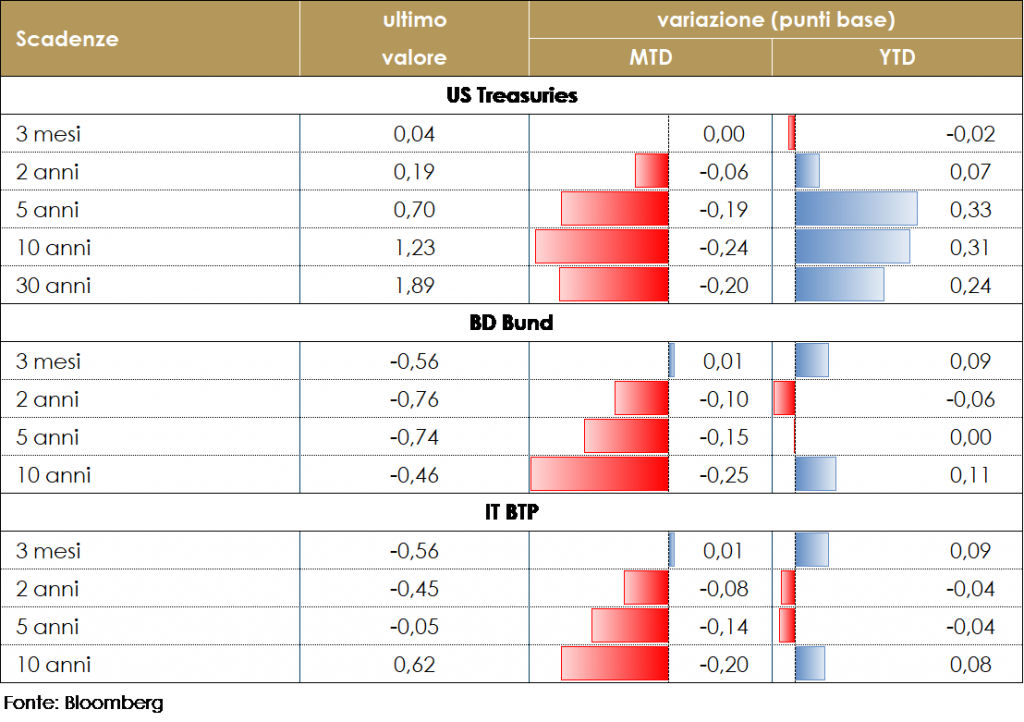 Di fatto il presidente Powell ha continuato a inviare un messaggio di pazienza che ha lasciato i mercati dei titoli governativi ampiamente invariati e non è riuscito a modificare il movimento al ribasso dei rendimenti a lungo termine, instauratosi dopo il FOMC di giugno Parafrasando le parole di J.Powell, il prossimo trigger di una rimodulazione delle aspettative potrebbero essere i dati sull’occupazione. Il rapporto sul mercato del lavoro della prossima settimana aiuterà a stabilire il tono per il resto dell’estate, mentre maggior dettagli sulla strategia di uscita dalle politiche monetarie accomodanti da parte della FED bisognerà arriveranno solo con il FOMC di settembre. Nell’Area Euro, i rendimenti governativi tedeschi sono anch’essi scesi, guidati dalla componente reale a fronte di un modesto aumento delle aspettative di inflazione. Il decennale tedesco si è, quindi, riportato a ridosso di -0.46%, il livello più basso dalla prima metà di febbraio, quasi 40bps in meno rispetto ai massimi di metà maggio. Lo spread decennale BTP-Bund ha allargato di circa 4bps rispetto alla chiusura di venerdì scorso. Si conferma comunque il trading range nonostante la tornata di aste che ha visto il collocamento di due nuovi benchmark (BTP short-term e il nuovo quinquennale con scadenza agosto 2026). PERFORMANCE DEI TITOLI GOVERNATIVI – Dati aggiornati alle 17.30 del 30 luglio 2021 VIEW STRATEGICA Governativo US Ci attendiamo una moderata tendenza al rialzo dei rendimenti governativi statunitensi, dopo il calo registrato nel secondo trimestre dell’anno guidato dalla componente reale e del term premium. Il meeting di giugno del FOMC ha portato ad una eccessiva ricalibrazione delle aspettative di mercato sulla politica monetaria statunitense: l’inserimento di due rialzi nelle previsioni nel dot plot è stato interpretato come un minor impegno verso la nuova strategia di average inflation targeting. La struttura a termine governativa statunitense dovrebbe rimodulare l’eccessivo flattening registrato nel secondo trimestre. Esprimiamo una view neutrale, dati i livelli raggiunti Governativo EU: I titoli governativi europei dovrebbero evidenziare un decoupling da quelli statunitensi, sulla scia delle aspettative di un ulteriore allentamento monetario da parte della BCE. |