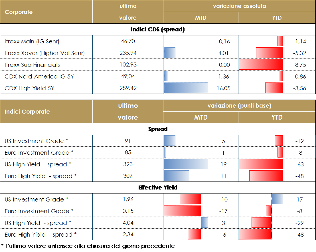 La settimana è stata molto tranquilla sui mercati del credito con operatività limitata dalla minore attività sia lato banche, real money ed emittenti. L’attenzione dei mercati si è concentrata sul meeting della Federal Reserve americana che ha comunque mantenuto sostanzialmente tutte le policy e confermato le attese del mercato che vedono solo più avanti, a partire da settembre, possibili novità indotte dalla migliore crescita, dal mutato quadro inflattivo e dai progressi sul mercato del lavoro.Sul mercato secondario i titoli corporate bond hanno avuto un buon bid senza comunque movimenti di rilievo nei total return degli indici che chiudono la settimana positivi ma con variazioni limitate.I CDS Indexes di cui riportiamo settimanalmente Itraxx Xover e CDX HY rispettivamente su Europa e US, hanno fatto segnare +5bp in Europa e ancora più stabile il comparto IG con CDX IG e Itrxx Eur Main in allargamento di 1bp. Sul primario poco da segnalare, una emissione su IG, Nasdaq (BBB, 615Mio, 12y, 0.9%) e una su HY Valeo (BB+, 700Mio, 7y, 1%). A cura del team obbligazionario di Mediobanca SGR PERFORMANCE DEI TITOLI CORPORATE – Dati aggiornati alle 17.30 del 30 luglio 2021 VIEW STRATEGICA Corporate IG: Outlook neutrale per il 3T 2021. Il livello e le valutazioni degli spread rendono vulnerabile l’asset class rispetto alle variazioni dei tassi e potrebbero subirne movimenti e volatilità, che nel complesso rimane ancora contenuta. Il supporto delle politiche monetarie continua a permanere fattore determinante per lo scenario. Corporate HY: Outlook neutrale con fondamentali in miglioramento ma valutazioni tornate sui minimi che riflettono in larga parte la buona fase ciclica. Default rate ancora contenuti con rating action al margine positive. La ricerca di rendimento e l’offerta netta contenuta segnalano fattori tecnici supportivi per il 3T. |