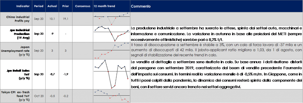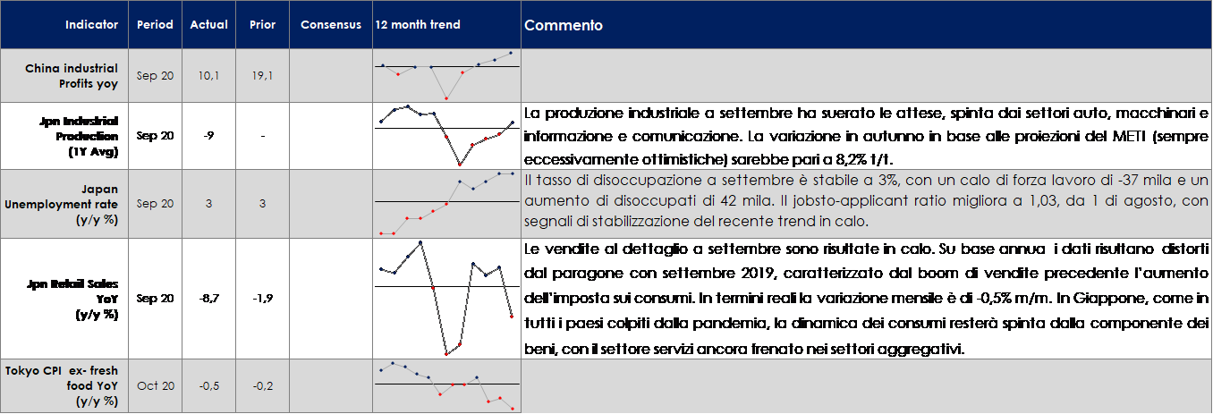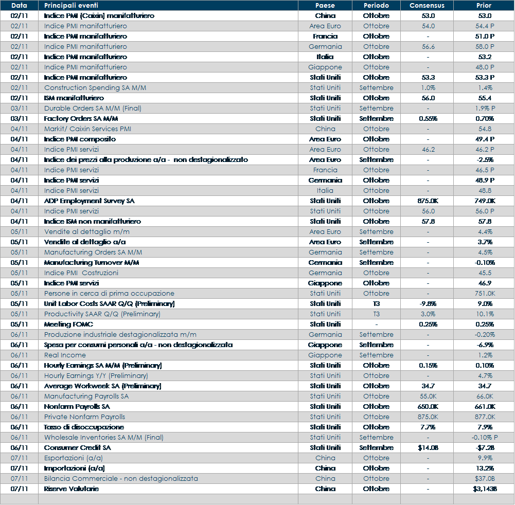 Stati Uniti: L’evento principale della settimana saranno senza alcun dubbio le elezioni presidenziali, seguite dal meeting di politica monetaria del FOMC che potrebbe assicurare condizioni finanziarie accomodanti in caso di incertezza derivante da un voto “non conclusivo”. Sul fronte macroeconomico saranno resi noti i valori dell’indice ISM e del mercato del lavoro per il mese di ottobre.