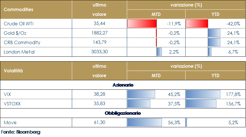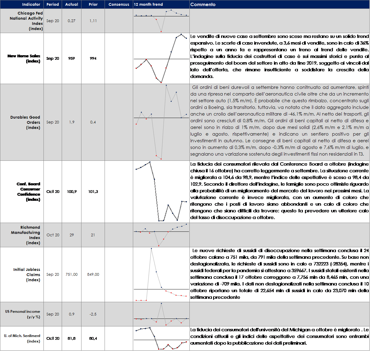 Europa: L’attenzione rimarrà concentrata sugli sforzi per controllare la seconda ondata di infezioni e su eventuali misure di contenimento aggiuntive. L’appuntamento di maggior rilievo sarà la riunione di politica monetaria della Bank of England. Indicazioni importanti arriveranno dal settore manifatturiero, con le letture dell’indice PMI di Francia, Germania, Italia, Spagna, l’intera Area Euro e il Regno Unito. Sempre sul fronte dell’offerta, la Germania comunicherà l’andamento della produzione e degli ordinativi industriali.