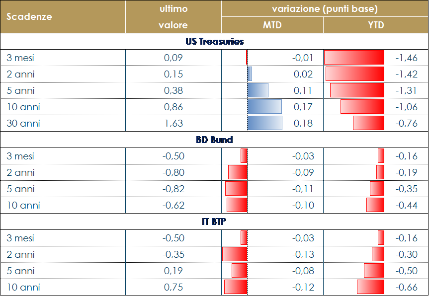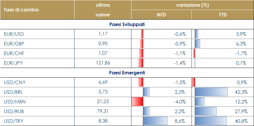 Senza modificare i parametri di politica monetaria (tassi a -50 punti base, la dotazione del PEPP ferma a 1350 miliardi di euro e l’APP a 20 miliardi di euro al mese), la BCE ha lanciato un segnale molto chiaro affermando che i rischi sono ora rivolti verso il basso. Il Presidente Lagarde ha, inoltre, ripetutamente sottolineato che il Consiglio Direttivo è stato unanime nel ritenere necessaria una ricalibrazione della politica monetaria e che non vi è stata alcuna obiezione interna sulla necessità di una politica più accomodante, poiché le prospettive economiche si stanno deteriorano e la pandemia sta mettendo a rischio la fragile ripresa dell’Area Euro.