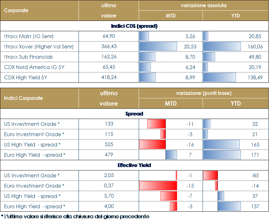 Il presente documento (il “Documento”) è stato preparato dalla Funzione Asset Allocation di Mediobanca SGR SpA (la “SGR”) a scopo puramente informativo. Il documento non ha carattere di offerta, invito ad offrire, o di messaggio promozionale finalizzato all’acquisto, alla vendita o alla sottoscrizione di strumenti/prodotti finanziari di qualsiasi genere. Inoltre, esso non è inteso a raccomandare o a proporre una strategia di investimento in merito a strumenti finanziari. In particolare il presente Documento non costituisce in alcun modo una raccomandazione personalizzata; lo stesso è stato predisposto senza considerare gli obiettivi di investimento, la situazione finanziaria o le competenze di specifici investitori. Il presente Documento è proprietà di Mediobanca SGR; esso non può essere riprodotto o pubblicato, nemmeno in una sua parte, senza la preventiva autorizzazione scritta della SGR. Le informazioni, opinioni, valutazioni e/o previsioni contenute nel presente Documento (le “Informazioni”) si basano su fonti ritenute autorevoli ed attendibili; tuttavia, la SGR non assume alcuna responsabilità per eventuali errori od omissioni né potrà considerarsi responsabile per le eventuali perdite, danni o conseguenze di qualsivoglia natura (legali, finanziarie o fiscali) che dovessero derivare dal fatto che si sia fatto affidamento su tale Documento. Ciascun investitore dovrà pertanto assumere le proprie decisioni di investimento in modo autonomo, tenuto conto delle sue caratteristiche e dei suoi obiettivi di investimento, e a tale scopo non dovrà basarsi, prioritariamente o esclusivamente, sul presente Documento. I rendimenti passati, eventualmente rappresentati nel Documento, non sono indicativi né garantiscono gli stessi rendimenti per il futuro. Le Informazioni contenute nel presente Documento costituiscono valutazioni aggiornate alla data della sua produzione e potrebbero variare nel tempo, senza necessità di comunicazione da parte della SGR.