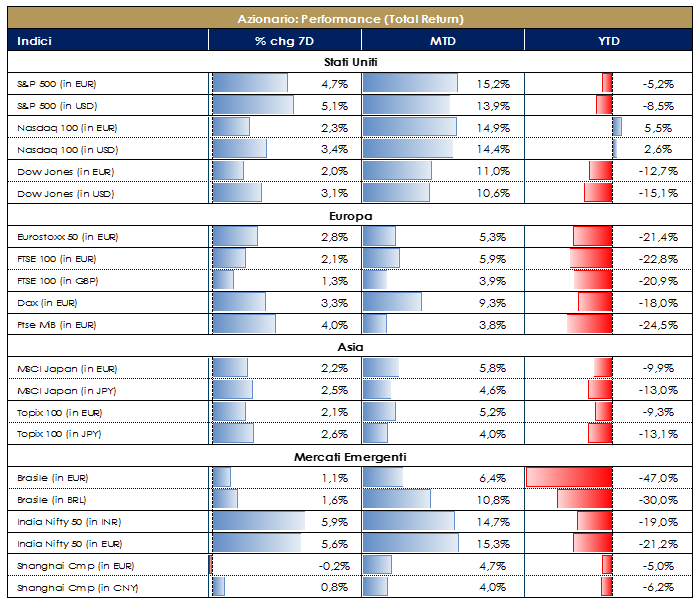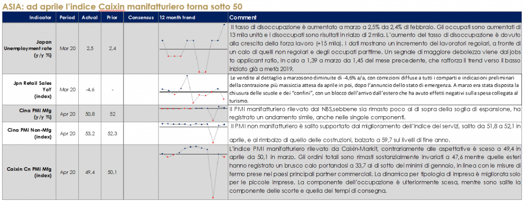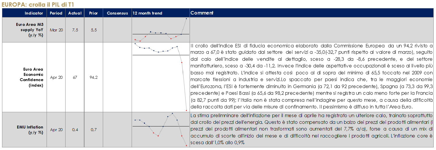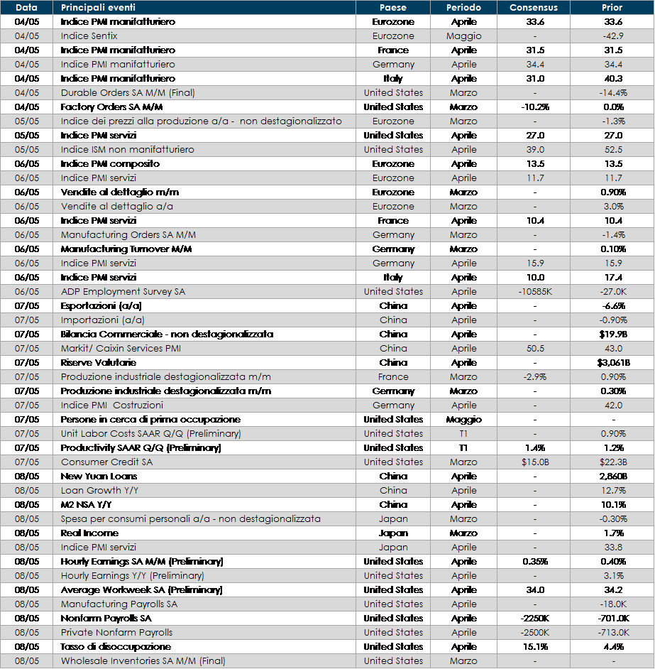 MERCATI AZIONARI Questa settimana siamo entrati nel pieno della reporting season del primo trimestre dell’anno; più del 30% delle società ha riportato in Europa e Stati Uniti ed il 17% in Giappone. In termini di revisione degli utili, la sorpresa è stata negativa nonostante le aspettative di consensus già posizionate su un double digit fall per il 1Q. Il settore finanziario è stato uno dei più impattati. In US settori difensivi meglio dei ciclici e crescita dei ricavi pressoché flat, con il 66% delle società che ha battuto le stime sulla topline e 65% sull’EPS. In Europa circa il 10% in meno, il 54% ha battuto le stime di EPS e il 67% quelle sui ricavi (-5% yoy), con crescita degli utili per commodities e risultati deludenti invece per finanziari e consumi discrezionali. Tra l’escalation della crisi covid-19 e il forte calo delle attività l’S&P500 sta affrontando il suo peggior trimestre del decennio in termini di revisione degli utili; la crescita dell’EPS del -16% yoy è la più bassa dalla GFC. Le note positive sono arrivate da Gilead, contrariamente ad una settimana fa, con il suo passo avanti nella cura del virus tramite il farmaco Remdesivir, dai primi effetti reali della riapertura in molte nazioni con la Cina che sembra stia gradualmente tornando ad una pseudo normalità (80% capacità produttiva) e la FED che ha confermato la volontà di continuare a dare supporto all’economia con obiettivi stabilità dei prezzi e ritorno ad un livello di disoccupazione intorno al 4-5%. Ad ogni modo, mercati azionari in rispolvero questa settimana con l’Indice europeo di riferimento SXXE che registra un +4%, sorretto da Banks a +10%, Auto&Parts +9,50%, Insurance e Airlines a +8%; i settori meno performanti nella settimana (seppur positivi in termini assoluti) sono stati Media, Retail ed Healthcare (+1%). In termini di single names, tra i best performer della settimana troviamo Elis, Deutsch Bank e BE Semiconductor (>25%) e tra i worst Wirecard (-30% a seguito della poca trasparenza sull’esito della due diligence condotta da KPMG incaricata di indagare sulla possibile falsificazione dei bilanci della società tedesca a seguito dell’accusa del FT), Teamviewer e Diasorin (-5%). Nonostante il declassamento di Fitch sull’Italia (BBB-) ad un solo notch dall’essere considerata “junk”, il FTSE MIB registra una performance positiva del +5,60% con Azimut, Banca Generali, Fineco ed FCA (>10%) tra i top e Diasorin (-5%), Ferrari, A2A e CNH tra i worst settimanali. Il mercato delle MidCap Italia chiude a +2,70% con Aquafil, Anima (rumors di M&A di Amundi), Dovalue ed OVS tra i best e IMA, SanLorenzo ed ERG tra i peggiori nell’Indice. In America, S&P500 a +3% trainato da Oil&Gas (+24%), Mcycl Manf (+22%) e Retail (+20%), contro i worst Brewers, Hypr&Supercntrs ed HealthCare Tech (-4%). A livello di singoli titoli Norwegian Cruise Line, Carnival Corp e Simon Property Group tra i best perforare contro Cincinnati Financial, Coty e Regeneron Pharma i worst. NASDAQ 100 a +2% con United Airlines, Tesla e Western Digital i top perforare della settimana. A cura del team Core Equity Value di Mediobanca SGR