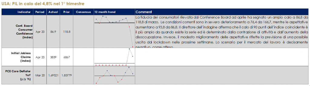 La pubblicazione della stima preliminare del PIL dell’Area Euro ha mostrato un calo pari a del 3,3% t/t vicino alla previsione di consenso del 3,5%. Dato che il blocco a livello nazionale è stato introdotto solo tra il 10 e il 22 marzo nelle economie più grandi, ciò lascia prevedere un calo maggiore dell’attività in T2, quando il blocco totale sarà in vigore per quasi la metà del tempo e sarà poi solo parzialmente revocato. I dati nazionali mostrano che il PIL è sceso del 5,8% t/t in Francia, del 5,2% q/q in Spagna e del 4.7% t/t in Italia. Infatti l’Italia seppur colpita gravemente dalla pandemia ha subito una perdita di PIL inferiore a quella di Francia e Spagna perché ha potuto avvantaggiarsi di dati migliori nel mese di gennaio. In Francia, il calo è stato trainato dal calo dell’11,8% degli investimenti, la contrazione del 6,1% dei consumi delle famiglie e anche le esportazioni e le importazioni sono diminuite del ~6%.