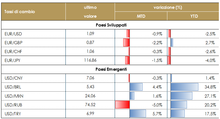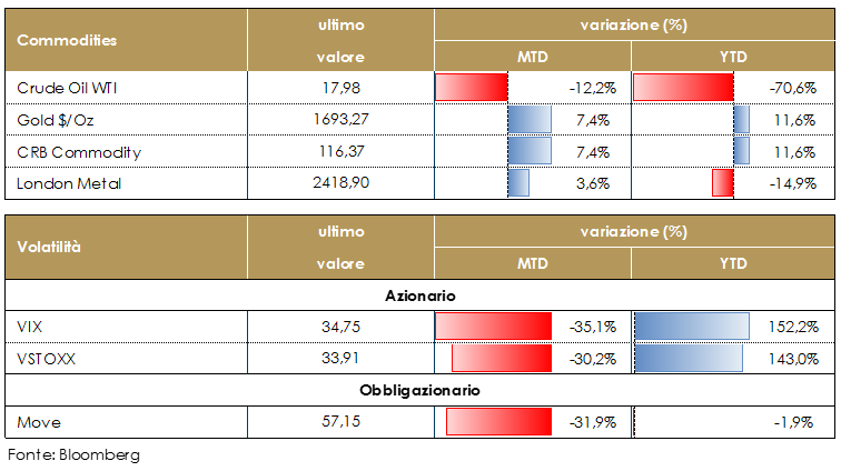 MATERIE PRIME E VOLATILITA’ Prosegue la volatilità sulle sui prezzi delle materie prime. Il prezzo del petrolio si stabilizza sotto i 20 dollari al barile grazie anche al supporto della Norvegia – annunciato in settimana- ai tagli di produzione. I dati API hanno rivelato un aumento di 10 milioni di barili di greggio nell’ultima settimana, al di sotto dei 13,2 milioni di barili della settimana precedente. La mancanza di stoccaggio rimane una preoccupazione generale tra le stime di produzione totale degli Stati Uniti Il sito di stoccaggio di Cushing in Oklahoma ha spazio ancora per 4-5 settimane al massimo, poi diventerà impossibile immagazzinare altre riserve strategiche. In questo contesto gli effetti di debolezza della domanda indotti dalla COVID-19 si stanno estendendo anche al gas, il cui prezzo è ai minimi storici in tutto il mondo. Ad esempio l’eccesso di offerta è diventato ingestibile, al punto che si sta facendo ricorso alle metaniere come depositi galleggianti: lo stesso accade con il petrolio, ma per il gas naturale liquefatto è molto raro, perché è una pratica costosa e pericolosa. Oro stabile, volatilità in rallentamento. Dati aggiornati alle ore 17.30 TASSI DI CAMBIO La settimana, guidata dalle riunioni delle banche centrali e dalla pubblicazione del PIL di T1 su entrambe le sponde dell’Atlantico ha visto oscillazioni contenute sulle principali valute. Il dollaro risulta marginalmente debole in scia ad una ritrovata propensione al rischio guidata sia dal rialzo dei mercati azionari e dal recupero del petrolio. L’euro si è mantenuto in area 1.08 rispetto a d dollaro, da un lato avvantaggiandosi del dato profondamente negativo del PIL di T1. Lo yen si è rafforzato ancora contro dollaro ma mantenendosi in area 106 USD/JPY mentre è indebolito contro euro da 115 a 116 EUR/JPY, per via del maggior rafforzamento dell’EUR/USD. La valuta nipponica trae beneficio dalla fase calante del dollaroma l’upside è limitato dato l’avversione al rischio si sta ridimensionando. Dati aggiornati alle ore 17.30 VIEW STRATEGICA Con l’incupirsi delle prospettive per l’economia globale, il dollaro USA si avvantaggerà del suo ruolo di valuta rifugio. |