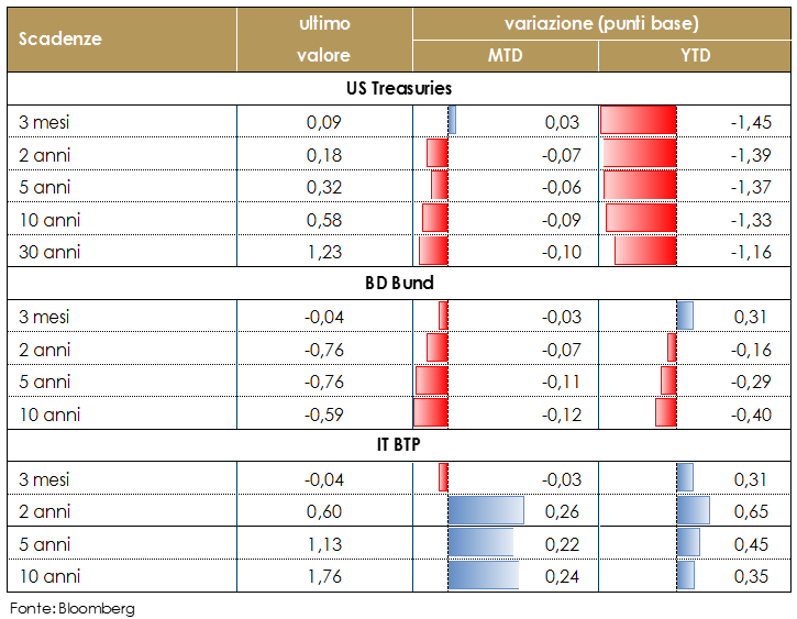 MERCATI DEI TITOLI GOVERNATIVI Il calendario della settimana ha visto l’uscita di dati macroeconomici cruciali per iniziare a misurare concretamente l’impatto dell’epidemia sulle economie nazionali, ma gli occhi del mercato sono rimasti puntati sulle riunioni delle principali Banche centrali. La Fed conferma l’attuale politica monetaria super-espansiva finché non vi sarà una ripresa dell’economia che porterà al raggiungimento degli obiettivi in termini di occupazione e inflazione. Continuerà ad acquistare titoli nelle quantità necessarie a supportare un funzionamento regolare del mercato, promuovendo una trasmissione efficace della politica monetaria. I tassi US rimangono dunque ancorati a livelli minimi con marginali variazioni rispetto alla settimana precedente. In Area euro le attese erano per la riunione odierna della BCE che conferma con decisione di essere pronta ad agire se necessario. I tassi core consolidano all’interno di un trading range piuttosto stretto (10y Bund entro la forchetta -0,40%/-0,50% di rendimento), mentre la periferia rimane più volatile senza una chiara tendenza di breve termine.Ieri, malgrado il declassamento di Fitch all’ultimo gradino di investment grade, i titoli italiani hanno comunque tenuto bene, così come dimostrato dal buon esito delle aste di fine mese (con questa settimana il Tesoro ha completato oltre il 30% del funding previsto sulla base dei numeri aggioranti nel DEF). La resilienza del BTP è giustifica principalmente dal supporto offerto dal PEPP e dal fatto che probabilmente il mercato non era disposto a presentarsi scarico di Italia alla riunione odierna della BCE. Si conferma dunque il ruolo di backstop svolto dalla BCE, in attesa di una risposta fiscale soddisfacente a livello UE. A cura del team obbligazionario di Mediobanca SGR