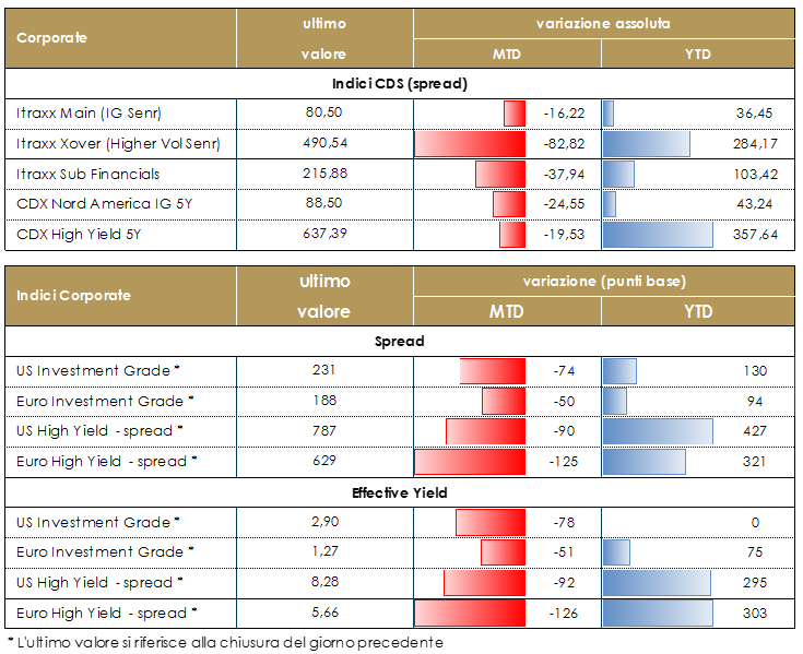 MERCATI DEI TITOLI CORPORATE Una settimana corta dominata dal newsflow delle banche centrali che confermano il supporto diretto e indiretto al mercato corporate che chiude con una direzionalità contenuta e con buoni flussi su cash a fronte di un primario ancora contenuto. Gli indici CDS Itraxx Xover e Main in Europa rispettivamente su Hy e Ig, hanno fatto segnare -10 e -2 bp di restringimento, mentre in Us la performance è stata più positiva con il miglioramento delle condizioni sul settore energy in buon recupero con CDX IG a -5 e HY a -40. Sul mercato secondario da segnalare i buoni flussi In acquisto che hanno permesso alla settimana di far registrare una buona performance e una volatilita’ molto contenuta sensibilmente inferiore alle precedenti.Anche il mercato primario ha vissuto una fase piuttosto limitata con emissioni su Corporate double tranche per Pernod Ricard, Pepsi Co e Heineken mentre su finanziari Santander e Rabobank e Credit Mutuel Arkea. A cura del team obbligazionario di Mediobanca SGR