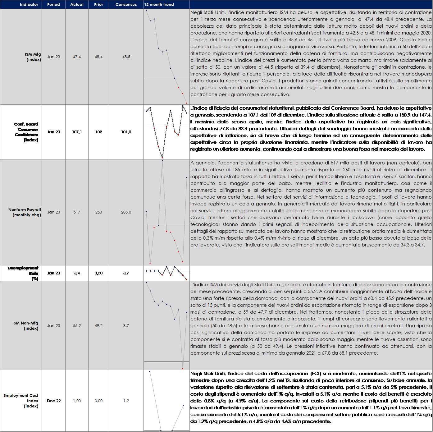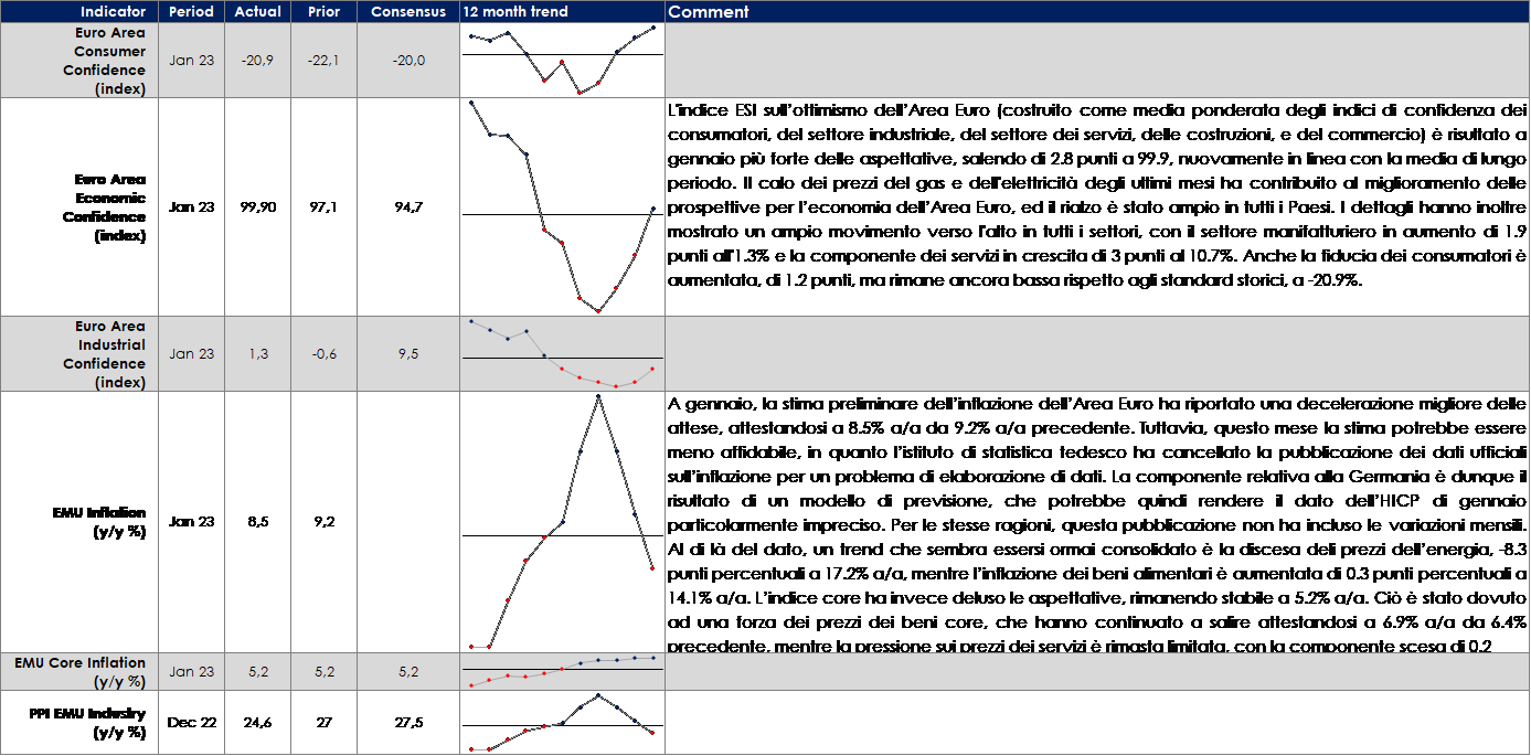 Il profilo dell’inflazione dei diversi paesi ha dettato i toni delle riunioni di politica monetaria di questa settimana. Negli Stati Uniti, il FOMC ha rallentato il passo degli aumenti del costo del denaro, riconoscendo che il processo disinflativo è in atto, adottando un tono maggiormente dovish. Nell’Area Euro, la BCE ha mantenuto un passo di rialzo pari a 50pb, a fronte di un‘inflazione core ancora in aumento, approfittando delle sorprese positive sulla crescita economica. Oltre Manica, la BoE ha alzato i tassi per decima volta consecutiva, a fronte di un’inflazione sopra il 10%, mentre il Governo ha dovuto gestire scioperi e proteste sociali, opponendosi ad aumenti salariali troppo generosi, che renderebbero cronicamente alta l’inflazione di questi mesi. La reazione del mercato è stata invece dovish in tutti tre i paesi.