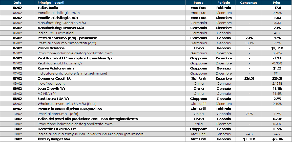 - Europa: In settimana nelle principali economie (Germania, Italia, Spagna ed Eurozona) verranno pubblicati i dati sulla produzione industriale del mese di dicembre. In Italia ed Eurozona troviamo anche le vendite al dettaglio, mentre in Germania gli ordinativi all’industria e l’inflazione preliminare di gennaio