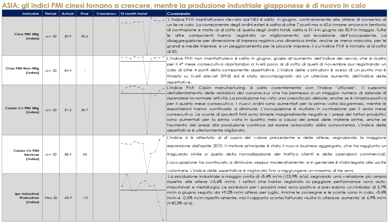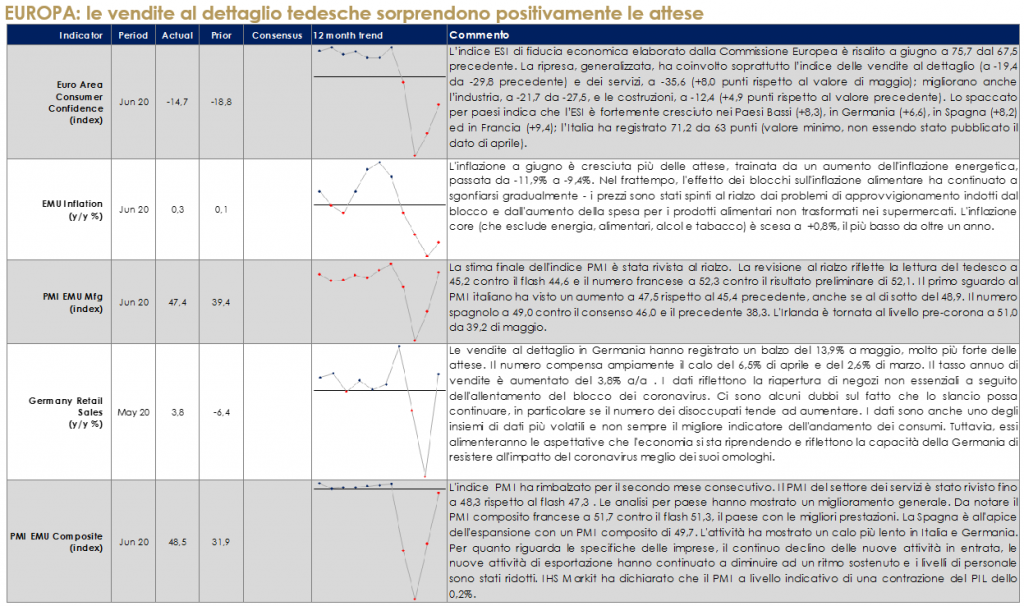 I verbali della riunione di giugno del FOMC descrivono un FOMC intento a valutare i prossimi passi e ribadiscono sia l’impegno ad agire come necessario per sostenere la ripresa sia la volontà di mantenere una stance di politica monetaria ampiamente accomodante ancora a lungo, attraverso una chiara guida sul sentiero dei tassi di interesse (forward guidance) e la continuazione del programma di acquisto di asset finanziari (QE). Emerge che in tempi brevi vi sarà una specificazione più dettagliata della forward guidance e del sentiero degli acquisti. L’ipotesi dell’introduzione di una leva basata sul controllo dei rendimenti governativi (YCC, yield curve control) ha ricevuto, invece, un supporto ancora tiepido.