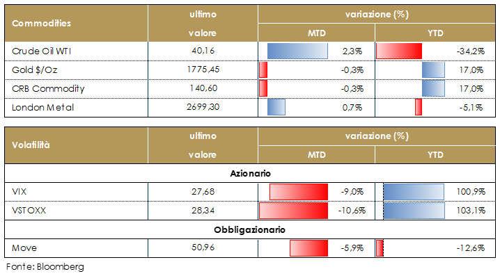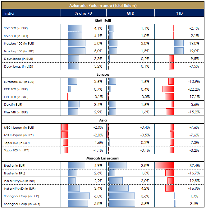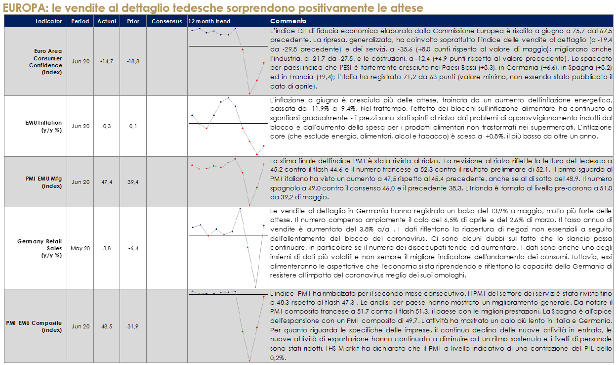 MERCATI AZIONARI Nonostante i nuovi massimi registrati in termini di contagi negli Stati Uniti e conseguente rallentamento delle riaperture e licenziamenti in California, New York, Arizona e Texas, questa settimana i mercati hanno beneficiato di un trend positivo rialzista ben sperando nelle news sull’avanzamento dello sviluppo di un vaccino per il covid-19 da parte di Pfizer e BioNTech (una delle 17 cure in fase di sperimentazione umana ha mostrato risultati soddisfacenti) e sui dati positivi dell’ISM manifatturiero di giugno tornato sopra la soglia critica dei 50 (52,6 vs 43,1 del mese precedente). Nonfarm Payrolls aumentano a 4,8 mln di nuovi occupati. Ottimismo anche sul fronte europeo in tema di Recovery Fund con il primo ministro olandese ottimista sul raggiungimento di un compromesso e supporto della Germania. Tedeschi protagonisti della settimana anche per il positivo dato sulle vendite al dettaglio (retail). PMI dell’Eurozona in rialzo (47,4 da 39,4 a maggio), a riconferma del miglioramento rispetto ai dati precedenti e di una normalizzazione (seppur Germania e Italia sotto i 50 punti). Correnti favorevoli quindi nella settimana ma con ancora alta incertezza, la quale obbliga a navigare a vista. Le prossime settimane saranno fondamentali nel definire l’outlook e il sentiment di mercato con l’inizio della reporting season per il 2Q e la visibilità del 2H20 (previsti in US ed EU tagli EPS e stime economiche riviste in base alla possibilità o meno di una second wave in autunno). In termini di performance settimanali, Indice SXXE europeo chiude in territorio positivo a +2,80% trainato dai settori ciclici i quali da metà maggio hanno registrato un’ottima recovery, con l’indice STOXX Europe 600 Optimised Cyclicals che ha guadagnato il 23% (verso un +11% del comparto difensivo): Banche +5%, Chimici +4,20% e Utilities +4% e rallentato invece da Oil&Gas 0%, Food&Beverage +0,20% e Travel&Leisure +0,80%. In termini di single names, Hellofresh e DeliveryHero i top performer +13% grazie ai positivi dati di crescita riportati; di contro, Alten -8,50%, Jeronimo Martins -5% e Unilever -3% i peggiori della settimana. EuroStoxx50 a +2,80% con Iberdrola top performer a +7% e Unilever e Danone i peggiori. Positivo anche il mercato italiano con FTSE MIB a +2,70% (UBI +8%, Nexi +7,70% e Mediobanca +7% i top contro Pirelli -2%, Moncler -2% e TIT -1,60% i worst); anche mercato delle MidCap positivo a +2,10% (Banca Sistema +20%, Dovalue + 11%, ERG, Credito Valtellinese e Reno De Medici a +10% i migliori contro Datalogic, Aeroporto GMarconi, Marr e Saras a -4% i peggiori). Mercato americano positivo con S&P500 a +4% grazie a Dept Stores e Air Ft&Log +10%; in termini di single names Fedex il top performer a +20% seguito da Wynn Resorts, Centene e Simon Property a +11% contro Hollyfrontier e Motorola a -3%. Nasdaq a +5% con Tesla leader a +26%. Dow Jones +3,25% trainato da Pfizer +7,70% (post news vaccino), Boeing e Nike +6%. A cura del teamCore Equity Value di Mediobanca SGR PERFORMANCE MERCATI AZIONARI – dati aggiornati alle ore 17.30 del 3 luglio 2020 VIEW STRATEGICA: l’ampia liquidità messa a disposizione dalla Banche Centrali, gli interventi di stimolo fiscale e i possibili flussi in ingresso sosterranno un ulteriore recupero del ciclo economico che supporterebbe il trend positivo dei mercati. |