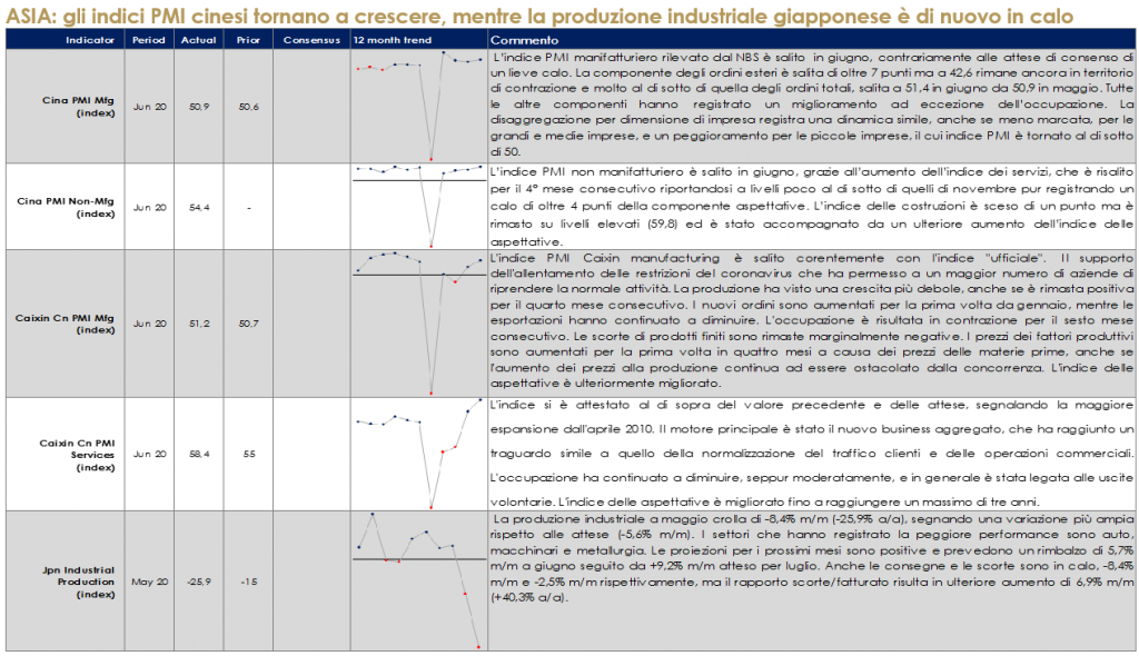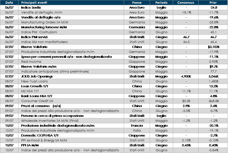 - Europa: per l’Area Euro, l’evento principale sarà la riunione dell’Eurogruppo per definire ulteriori dettagli tecnici sulla proposta di fondo di ripresa dell’UE in vista del vertice UE di metà luglio. Francia, Germania e Italia rilasceranno i dati sull’andamento della produzione industriale