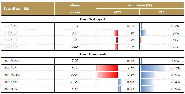 Il prezzo del petrolio chiude la settimana sopra i 40 dollari al barile, dopo il dato in calo delle scorte settimanali API. Resta comunque volatile sulla scia delle notizie dell’aumento dei contagi e dei timori di nuovi blocchi dell’attività imposti da un ritorno dell’epidemia.E’ continuata anche questa settimana la forza del prezzo dell’oro, usato da molti investitori come copertura rispetto ai rischi di un’ulteriore caduta dell’attività economica. Da metà aprile, l’oro ha rafforzato il ruolo di safe haven. Le rinnovate preoccupazioni per le infezioni da COVID-19 hanno spinto l’oro a nuovi massimi il 30 giugno. Dati aggiornati alle ore 17.30 del 3 luglio 2020 TASSI DI CAMBIO Il mercato dei tassi di cambi continua ad essere guidato dal ribilanciamento delle aspettative influenzato positivamente dal miglioramento dei dati economici e negativamente dall’aumento dei tassi di infezione da Covid-19. Il sentiment in Asia è stato aiutato dai dati PMI dei servizi Caixin fuori dalla Cina, più forti del previsto. Le valute G10 hanno visto uno scarso movimento, con la maggior parte dei G10 USD-crosses trading all’interno di intervalli ristretti. Nelle prossime settimane l’andamento dell’euro e della sterlina saranno profondamente influenzate dalle decisioni di politica fiscale ed in particolare. Due eventi chiave potrebbero determinare le prospettive a breve termine per la sterlina e l’euro. L’8 luglio verranno definiti i dettagli del piano di stimolo fiscale britannico. La risposta del mercato FX potrebbe rimanere sottotono fino a quando le misure politiche non includeranno tagli fiscali, che potrebbero avere un impatto positivo più immediato sulla crescita. Per quanto riguarda le prospettive dell’euro, la riunione dell’Eurogruppo del 9 luglio cercherà di trovare un terreno comune sul Recovery Fund prima dell’importantissimo vertice UE del 17 e 18 luglio. La definizione dei dettagli del piano (proporzione grants/ loans e condizionalità) influiranno profondamente sull’andamento della valuta comune. Dati aggiornati alle ore 17.30 del 3 luglio 2020 VIEW STRATEGICA: con l’incupirsi delle prospettive per l’economia globale, il dollaro USA si avvantaggerà del suo ruolo di valuta rifugio. |