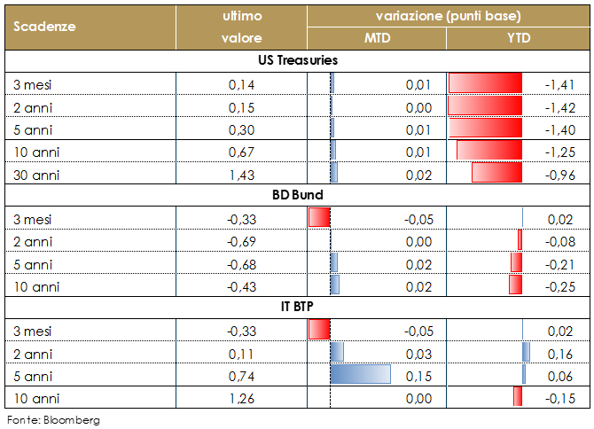 Leggero rialzo dei risk-free asset sia in Area euro sia negli USA in scia all’aumento delle aspettative di inflazione su entrambe le sponde dell’Atlantico e ai dati macro ben oltre le attese. A trainare i mercati incidono anche le notizie sul fronte di un possibile vaccino al covid19, elemento che per il momento sta oscurando il numero di contagi negli stati americani. Negli USA, i tassi T-Note chiudono poco mossi dopo essere saliti velocemente in scia ai dati sul mercato del lavoro e scesi altrettanto rapidamente dopo i dati sui nuovi contagi. Il segretario del tesoro Mnuchin ha dichiarato che il governo sta pensando ad ulteriori finanziamenti diretti a imprese e famiglie oltre a possibili aiuti nei confronti degli stati e amministrazioni locali.Nell’Eurozona, il generale clima di risk-on si è riflesso soprattutto sullo spread BTP-Bund in chiaro restringimento. Bene anche Spagna e Francia: si avvicina la scadenza di metà luglio per l’accordo sul recovery fund, Ursula Von der Leyen ha ribadito alla cancelliera Merkel che è arrivato il momento di andare oltre l’interesse nazionale e focalizzarsi sui benefici per tutta l’UE. Rimane poco mosso il resto del mercato obbligazionario, con gli operatori che continuano ad acquistare titoli core nonostante la performance dei listini azionari. Lato flussi, settimana dai toni pre-festivi con acquisti concentrati su BTP scadenza 5y e 7y. Continua il successo nel collocamento dei titoli italiani: ottima domanda sull’asta BTP, il bid to cover sul 10y è uscito ai massimi dal 2012. In questa fase di mercato sono soprattutto i non domestici a puntare sui titoli di stato italiani, considerando positivamente il risk reward offerto dall’Italia in vista anche della sempre più probabile soluzione sul Recovery Fund. Annunciate oggi le cedole minime garantite per il nuovo BTP Futura: 1.15% (dal 1-4 anno), 1.30% (dal 5-7 anno), 1.45% (dall’8-10 anno). A cura del team obbligazionario di Mediobanca SGR PERFORMANCE DEI TITOLI DI STATO Dati aggiornati alle 17.30 del 3 luglio 2020 VIEW STRATEGICA Governativo US: il taglio precauzionale e preventivo della Fed di 50 bps ad inizio marzo, coerente con i timori di diffusione del Coronavirus su scala globale, ha riportato i rendimenti governativi abbondantemente sotto l’1% sulle principali scadenze. Alla luce della volatilità nell’attuale fase (possibili ulteriori tagli e funzione di hedge) manteniamo una view neutrale. Governativo Euro: non si identifica valore in questa asset class a fronte di rendimenti ampiamente negativi i nparticolare delle emissioni tripla A (YTM bund -0,75%). |